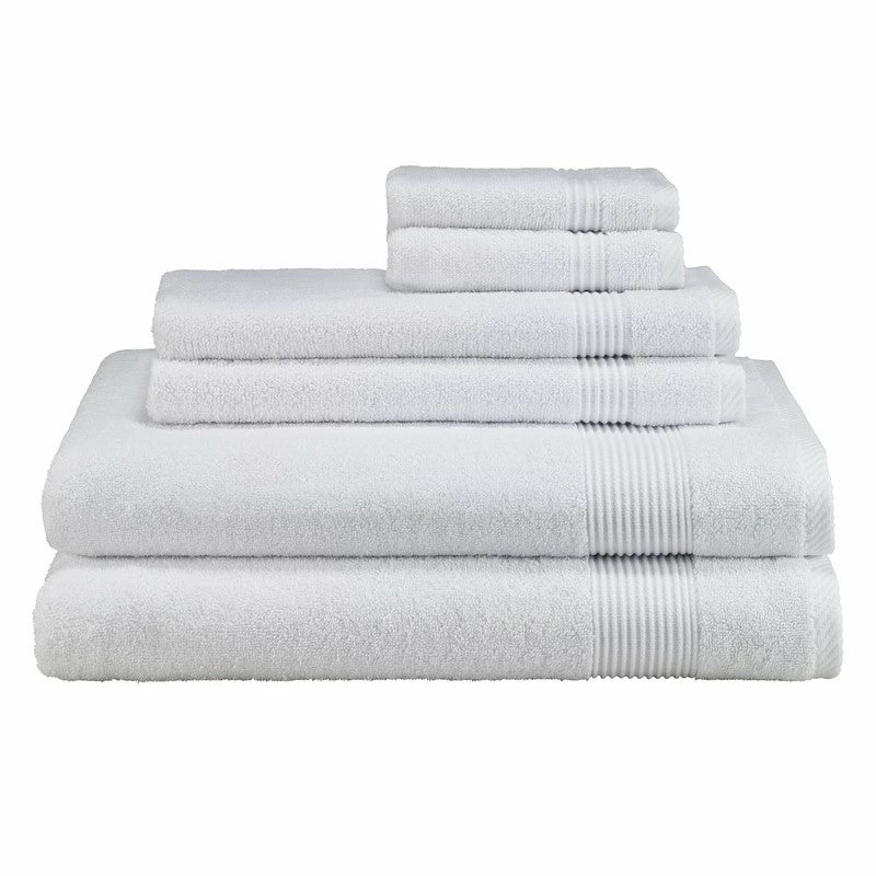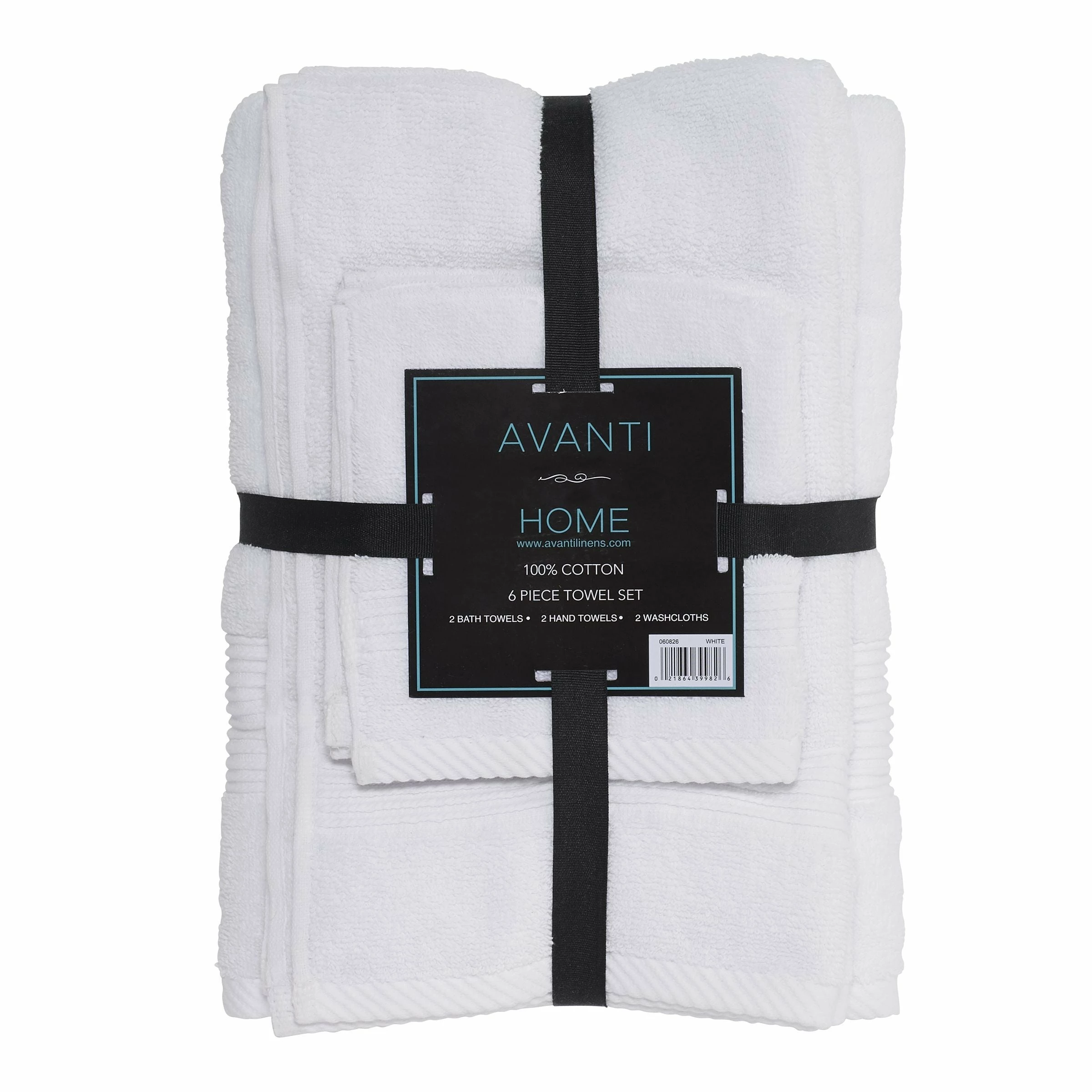 The Avanti White 6 piece solid color towel set is made from 2-ply super-soft and absorbent 100 percent cotton. Set includes 2 each of bath towel, hand towel and washcloth.