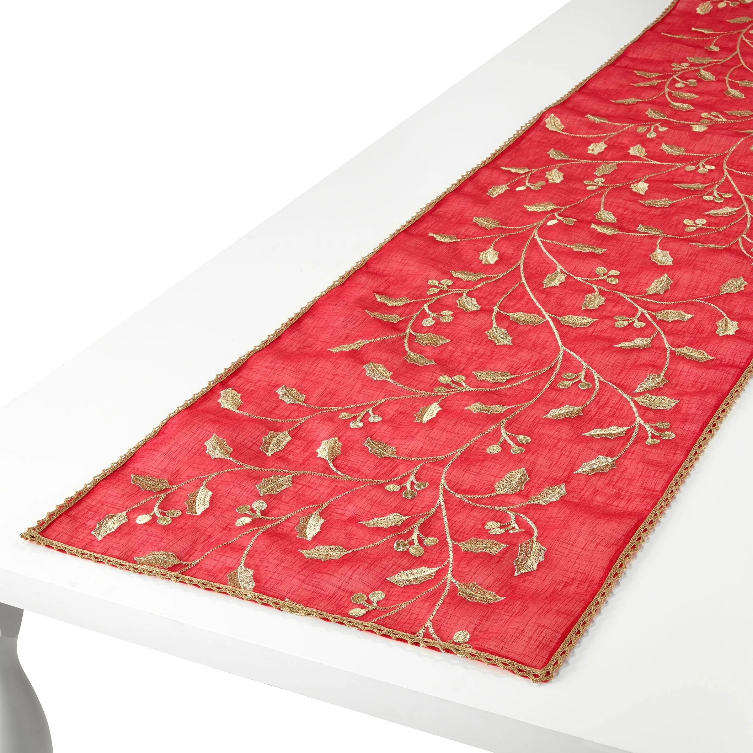 The Avanti Allover Leaf 16″ x 90″ Runner is beautifully decorated with an embroidered gold holly leaf, berry and vine design that runs end-to-end. The border is edged with a coordinating gold scallop on all four sides. Made of 100% polyester for easy care.