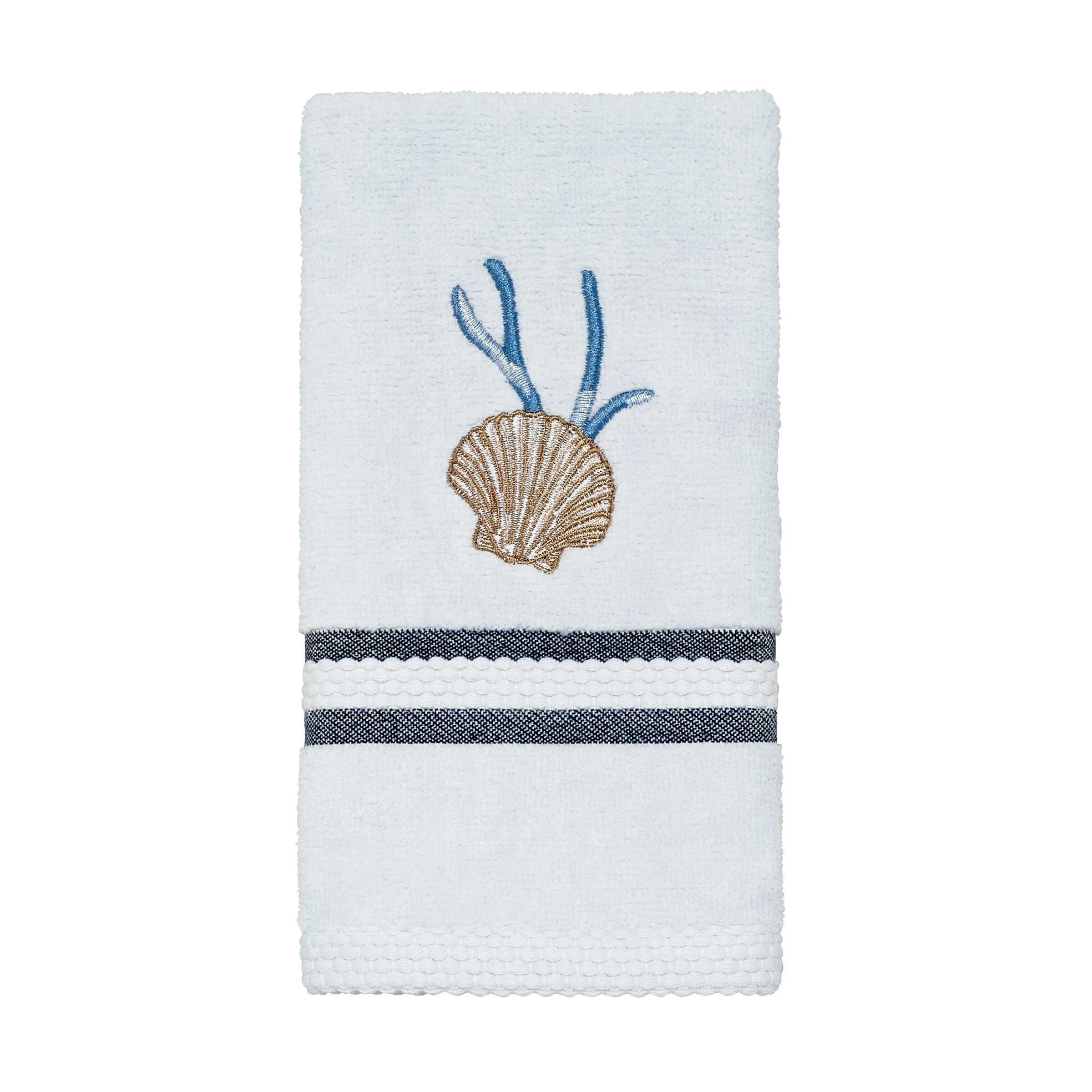 The Avanti Blue Lagoon Fingertip Towel features a beautifully embroidered fan shell and coral in shades of blue and beige on a 100% cotton white terry towel. The towel is finished with 2 coordinating navy horizontal stripes. Imported.