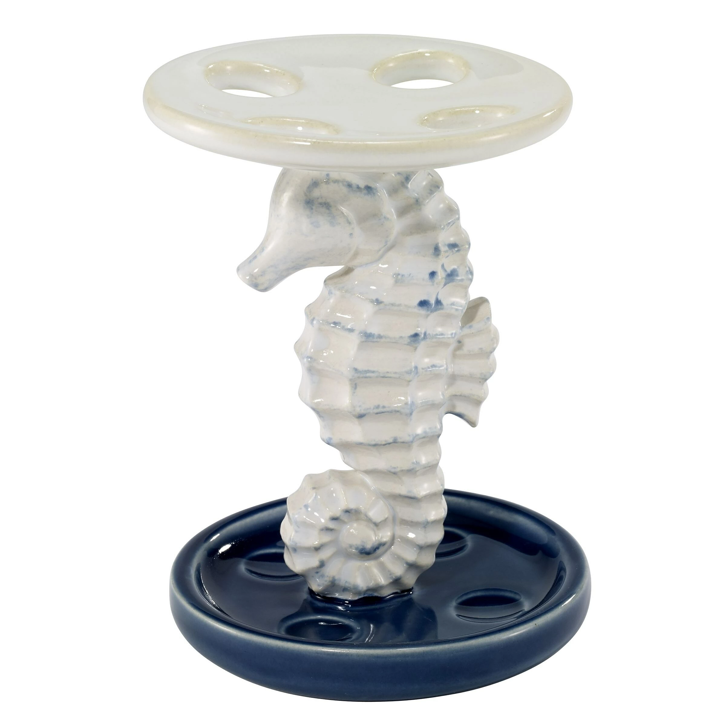 The Avanti Batik Coastal 4-Piece Accessory Set features two-tone white and blue glaze for a hand-painted, unique look. Decorated with debossed sea creatures, made of durable stoneware. Set includes one each of tumbler, toothbrush holder, soap dish, lotion/soap/sanitizer dispenser. Imported.