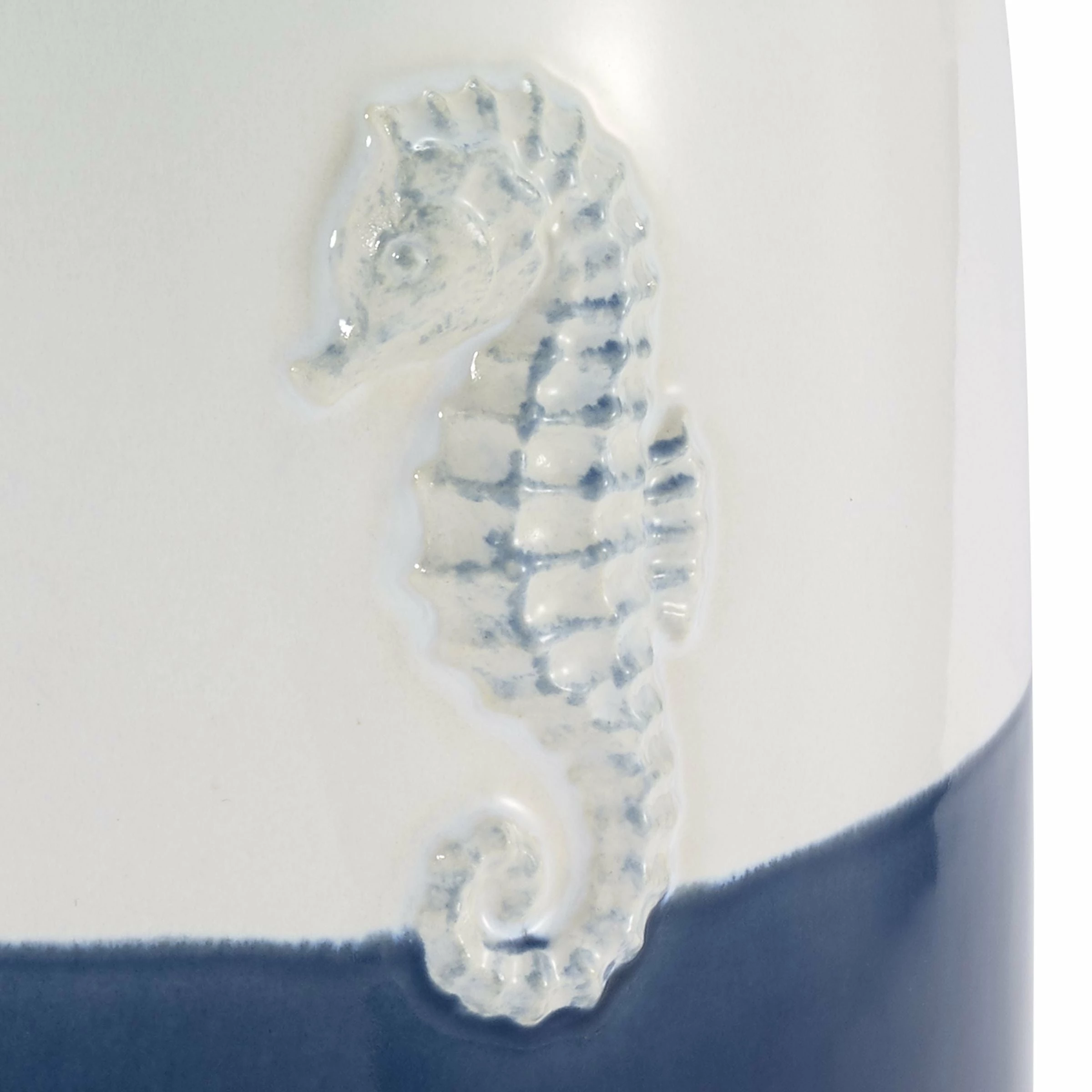 The Avanti Batik Coastal Wastebasket features a two-tone white and blue glaze for a hand-painted, every-piece-is-unique look. Decorated with debossed starfish, seahorse, sand dollar and coral. Made of durable stoneware. Coordinating shower curtain, rug, towels, accessories also available.Imported.