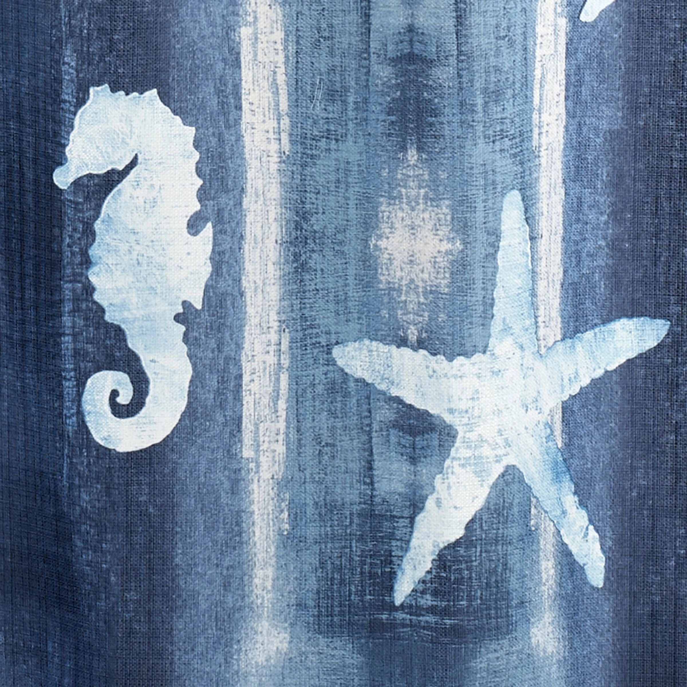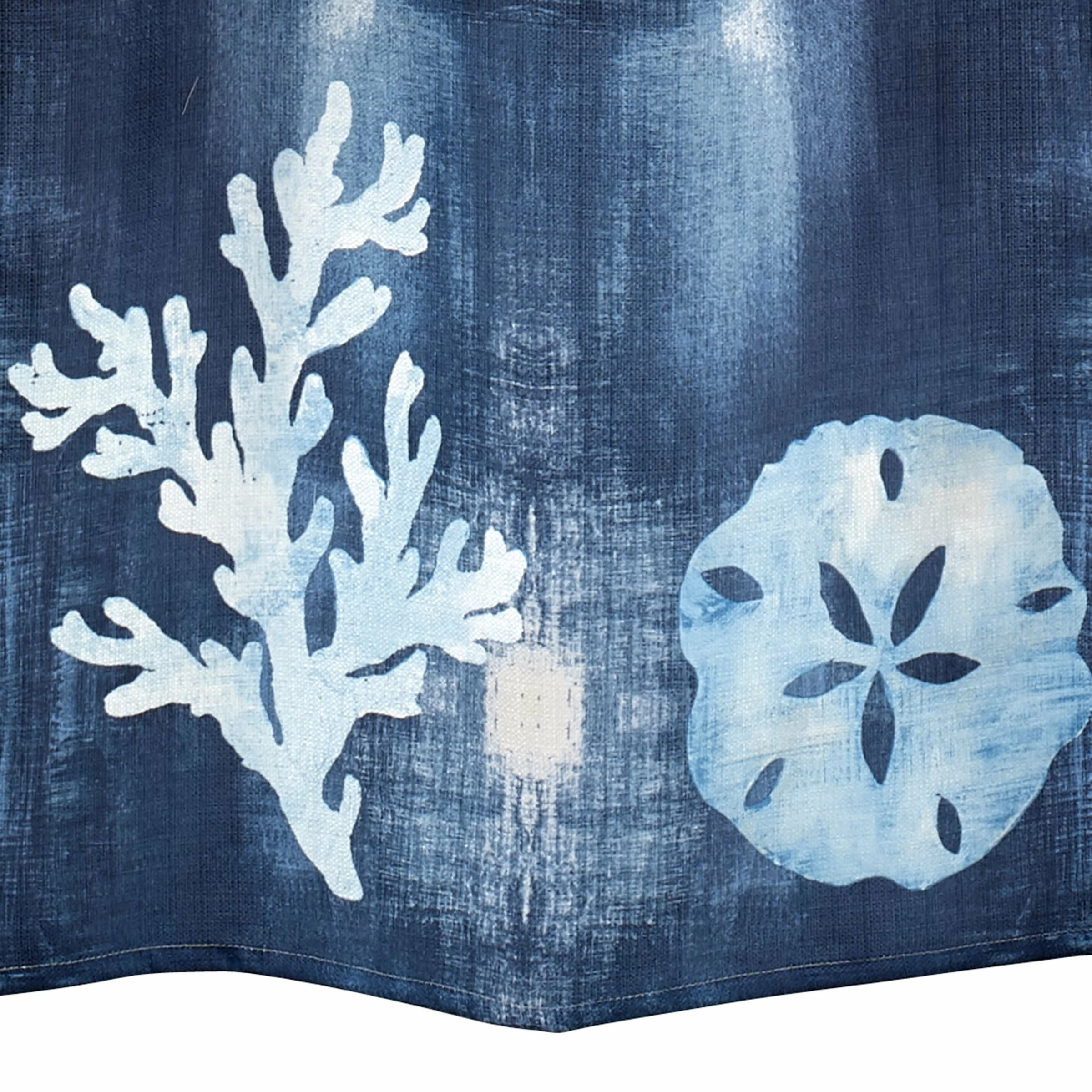 The Avanti Batik Coastal Collection Shower Curtain is decorated with ocean icons-coral, starfish, seahorses and sand dollars- on an ombred navy blue-to-white ground. Printed on 100% polyester, 72 x 72 in., coordinates available. Brings a little of the beauty of the sea to your bathroom . Imported.