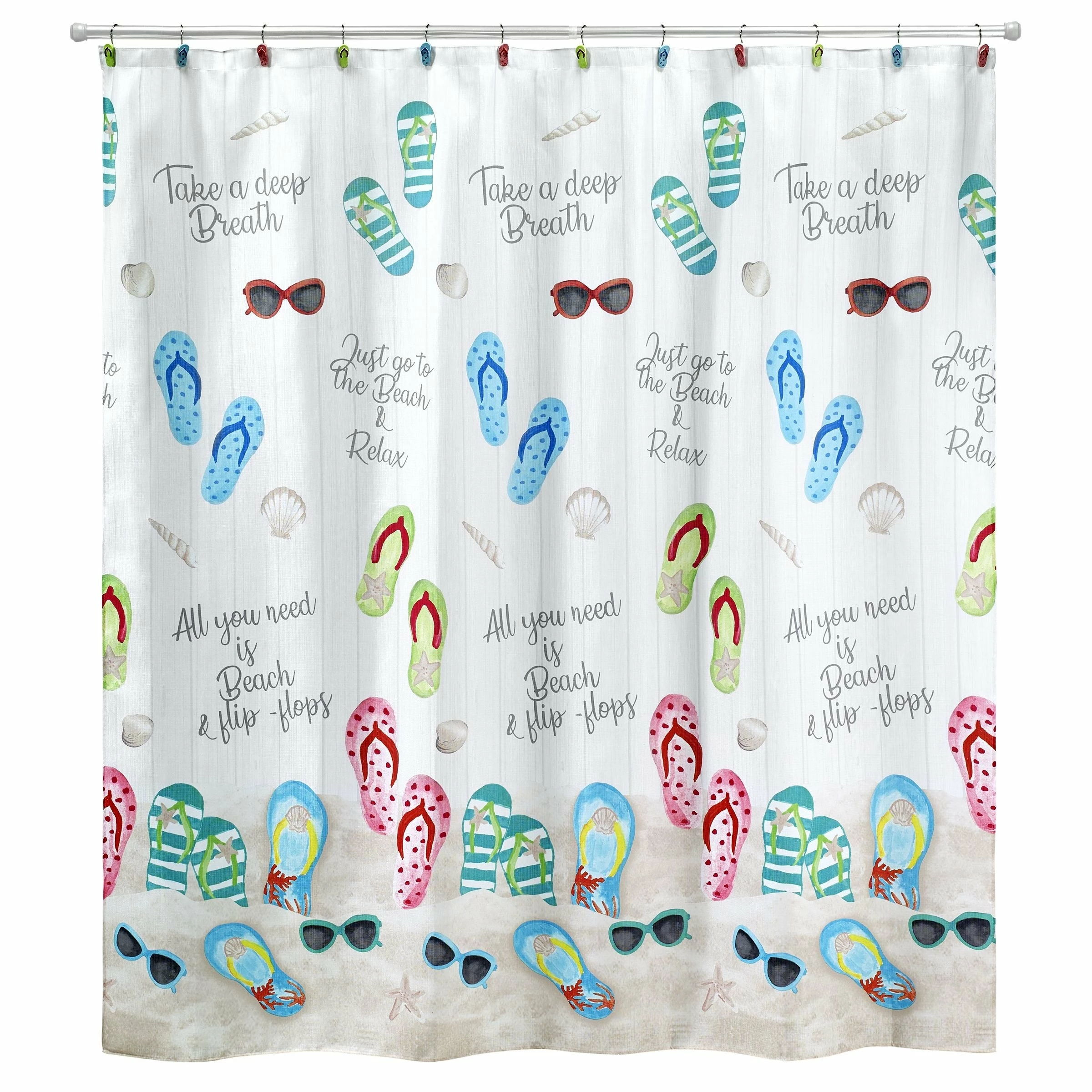 The Avanti Beach Mode Collection 13-Piece Shower Curtain and Hook Set is decorated with beach sayings, flip-flops and sunglasses on a white 100% polyester shiplap ground, 72 x 72 in. The hooks feature 3 different flip-flops, made of hand-painted resin. Set includes 1 curtain and 12 hooks. Imported.