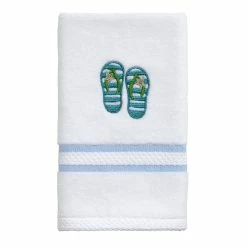 The Avanti Beach Mode 3-Piece Towel Set is decorated with colorful embroidered flip-flops in shades of blue and green on a white ground. Made of soft, absorbent 100% cotton ringspun terry with polyester light blue border. Set includes 1 each of bath, hand and fingertip towels. Imported.