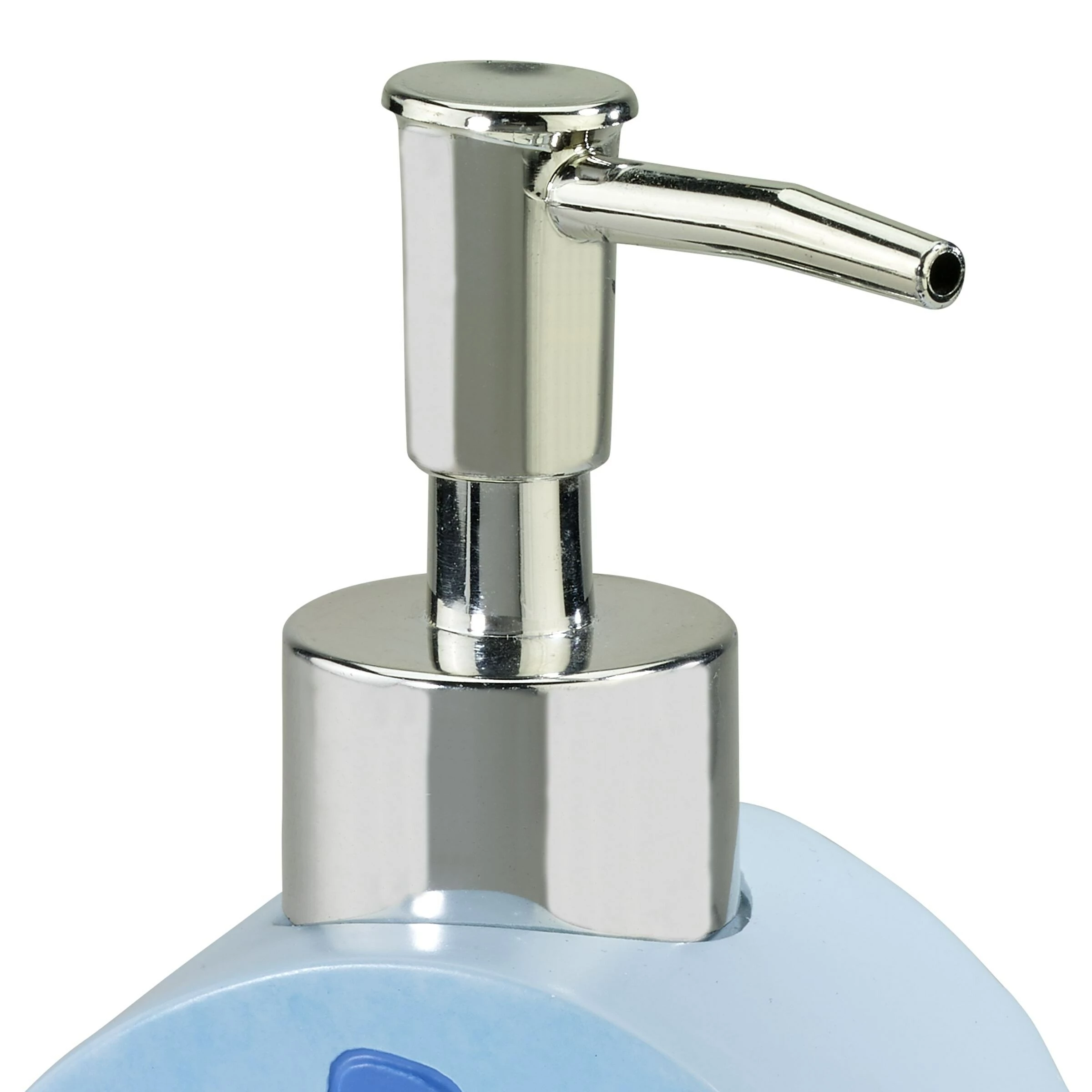 The Avanti Beach Mode Collection Lotion, Soap or Sanitizer Dispenser is a 3-dimensional blue flip-flop. Made of durable, hand-painted resin, pink coral and a ivory sand shell on a sand base finish the look. Fully coordinating bath accessories, shower curtain, towels and rug also available. Imported.