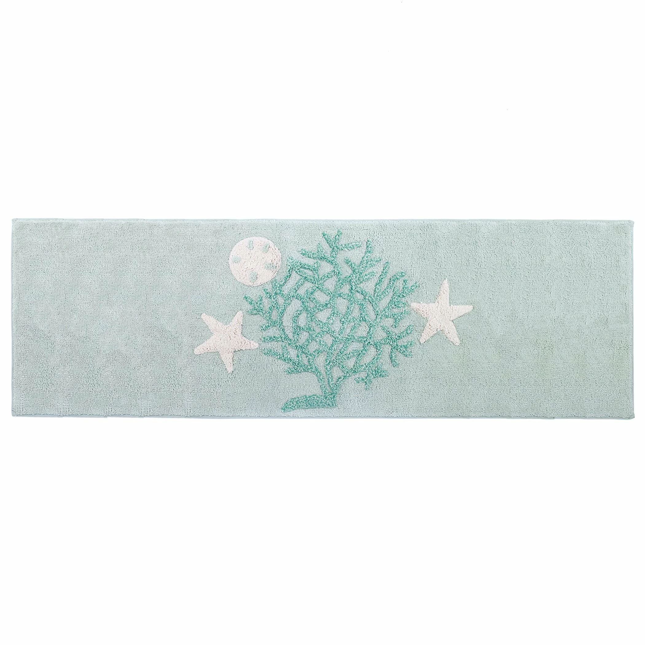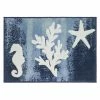 The seascape design features a teal coral with ivory starfish and shell on an aqua background. The Avanti Beachcomber Rug is tufted in 100% cotton. This oversized rug is skid resistant and machine washable.