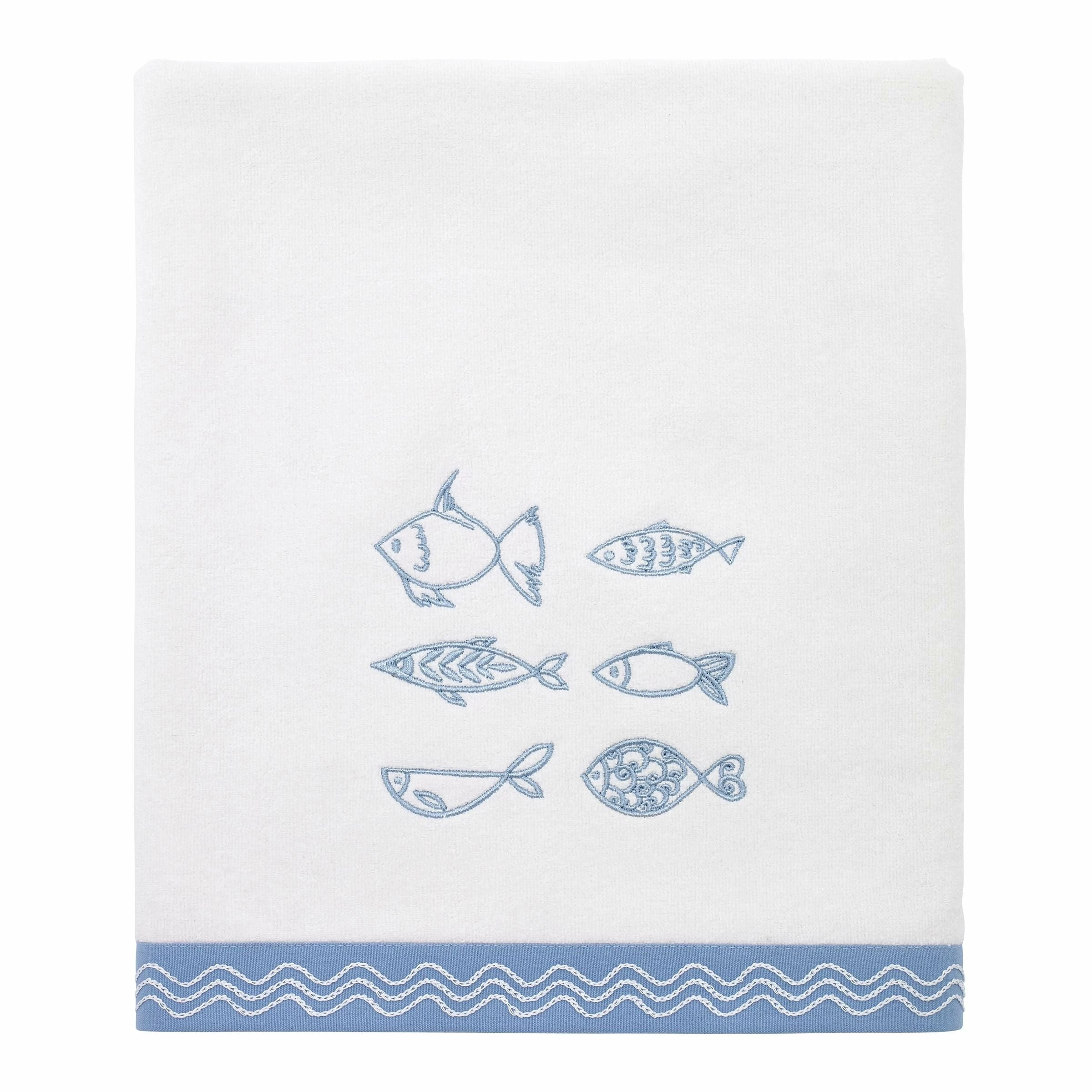 The Avanti Blue Fin Bay Decorative Bath Towel features six embroidered fish outlined in medium blue on a white ground. The towel is 100% cotton white velour face with terry back and finished with a coordinating fabric border. 27″ x 50″, machine wash warm, tumble dry low.