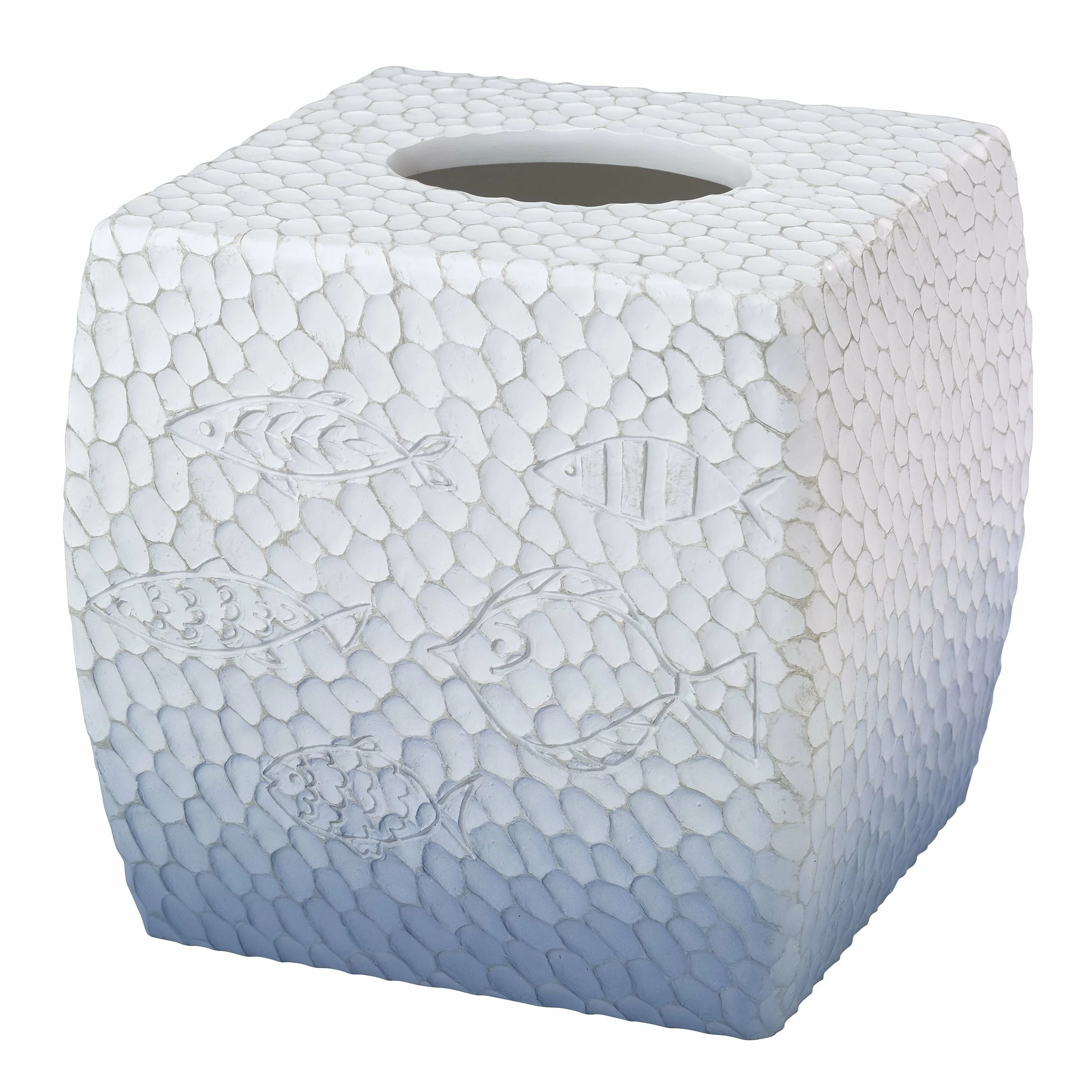 The Avanti Blue Fin Bay Tissue Box Cover is decorated with embossed primitive-looking fish swimming around the piece. Starting with a medium blue bottom, the color lightens as it moves up to the top finishing in a light blue. Made of durable, hand-painted resin for long-lasting use.
