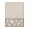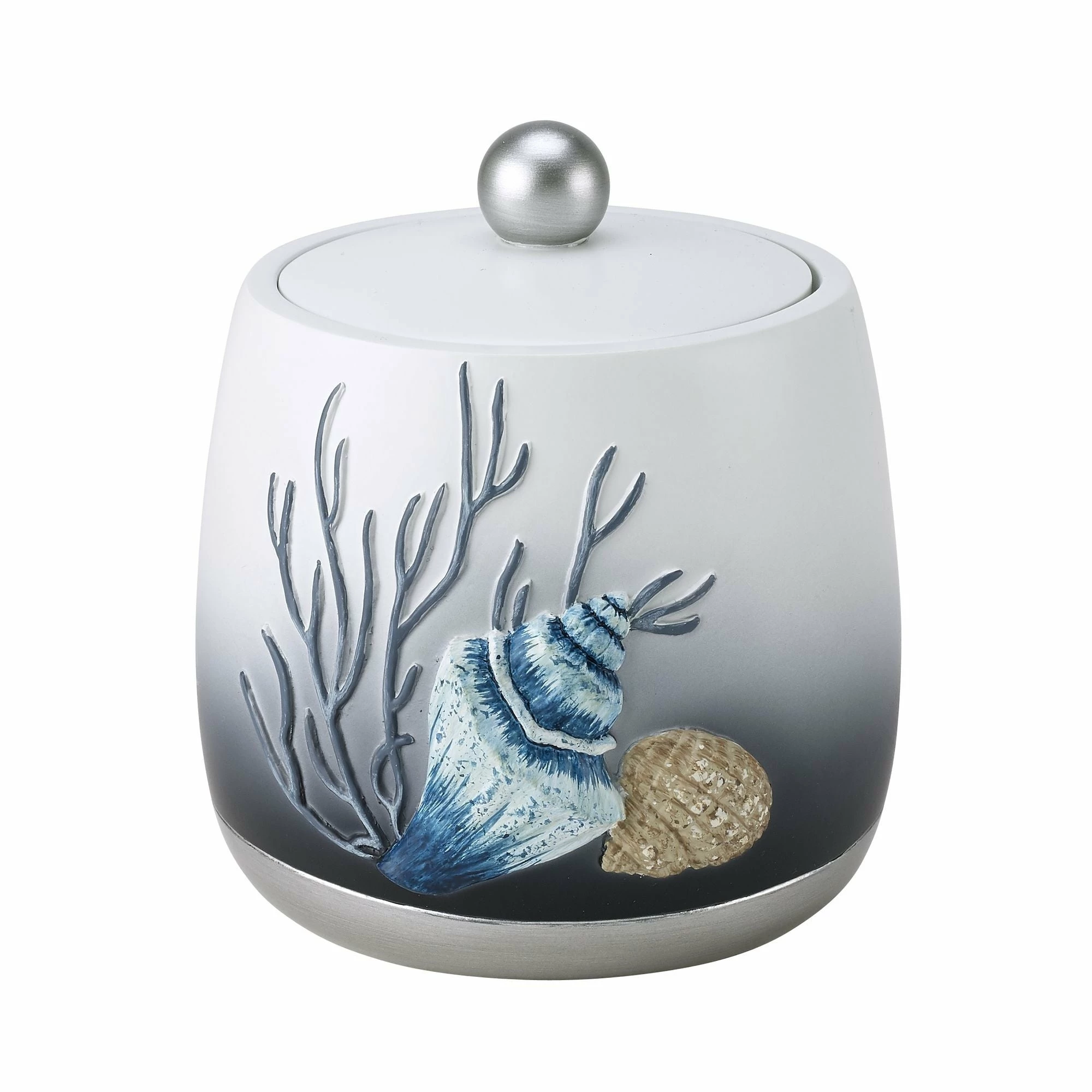 The Avanti Blue Lagoon Covered Jar is decorated with raised starfish, shells and coral in shades of blue and beige on an ombre base that goes from off-white to dark blue. A contrasting silver border adorns the bottom. The cover is topped with a silver ball pull for easy removal. Made of durable resin, hand painted. Imported.