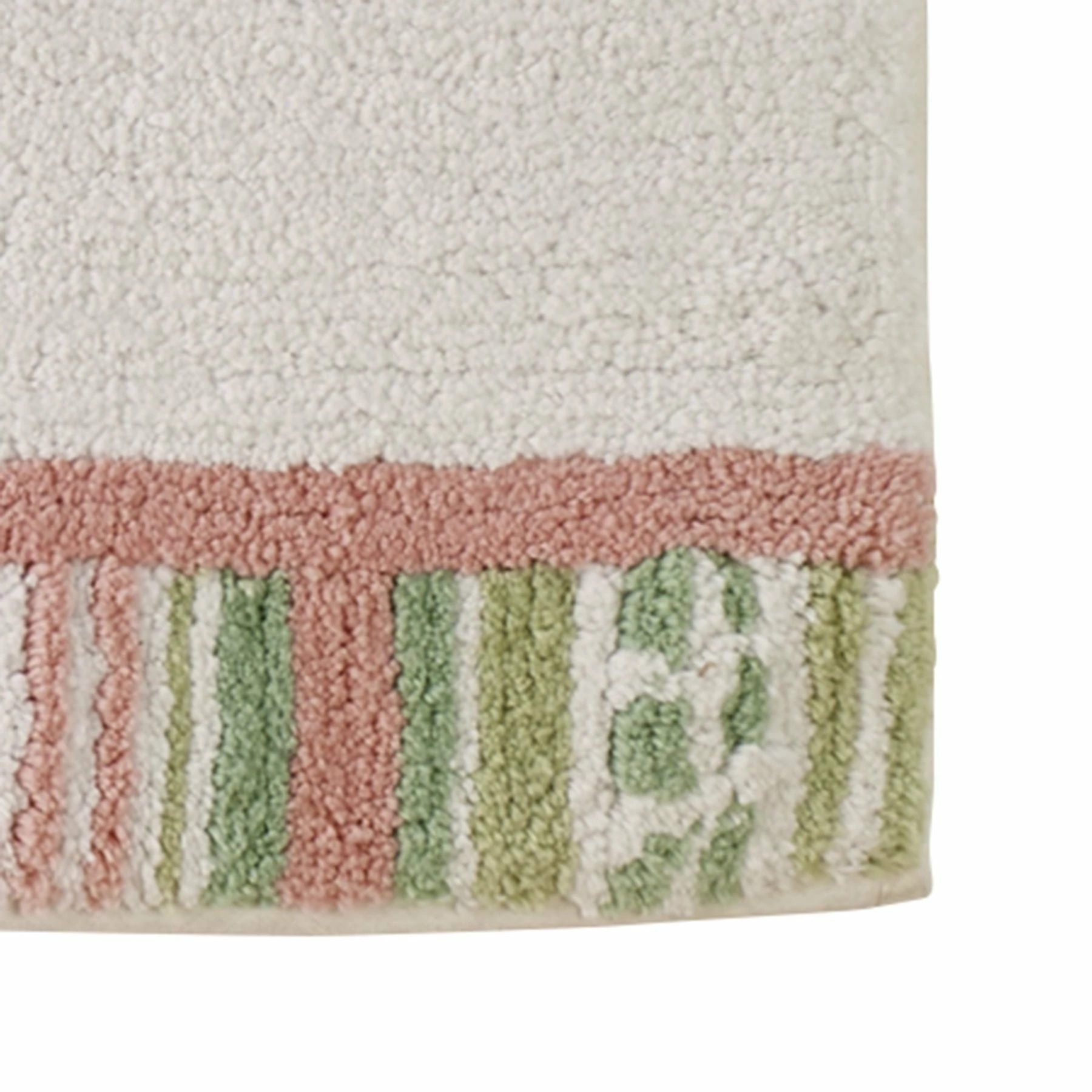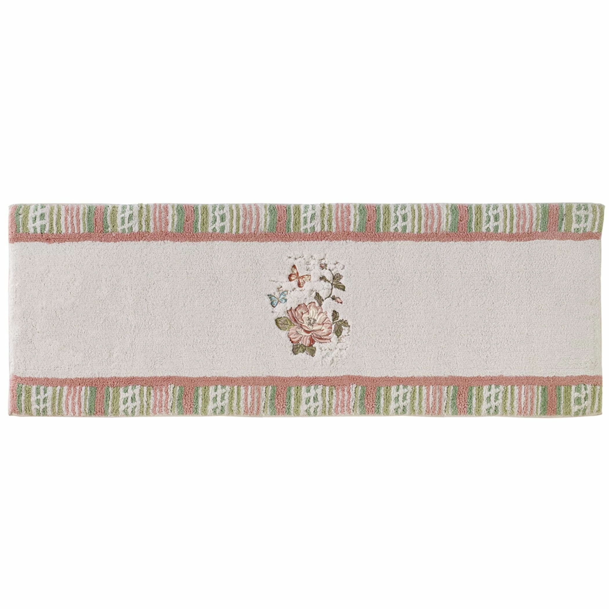 The Avanti Butterfly Garden Rug is tufted in 100% cotton and embroidered with the beautiful rose and butterfly design. The rug is framed top and bottom with a coordinating multi-color stripe. This oversized rug is skid resistant and machine washable.