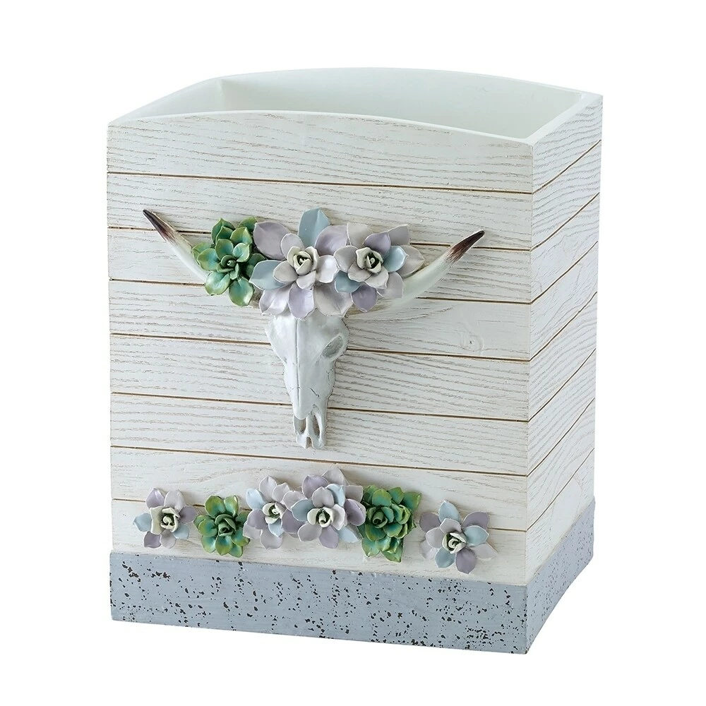 The Avanti Canyon Wastebasket features a textured off-white wood-grained ground decorated with a cow skull and desert flowers in green, lilac and blue, crafted in life-like dimensional detail. Adds a touch of the southwest to any bathroom, kitchen, bedroom or office. The piece sits in a textured aloe-blue base with brown splattered accents. Coordinating shower curtain, rug and towels also available. Made in resin, imported.