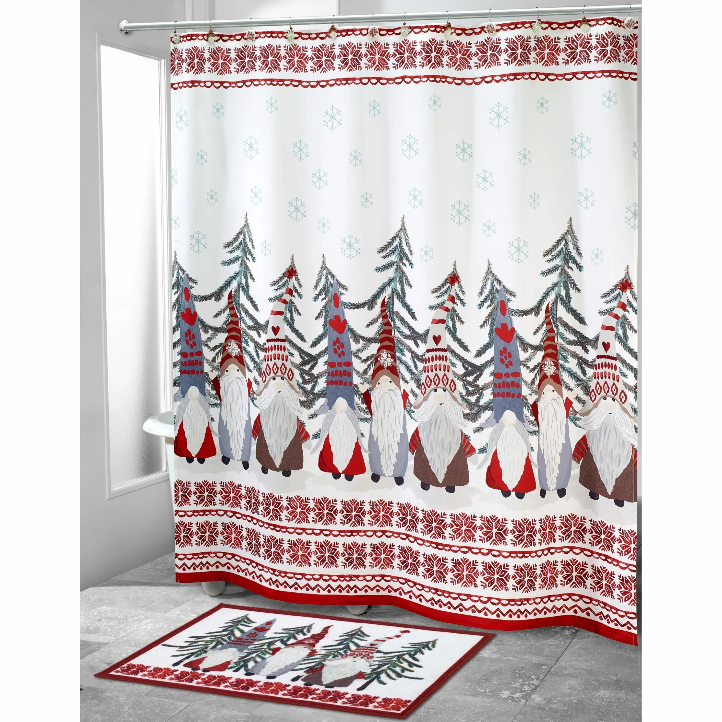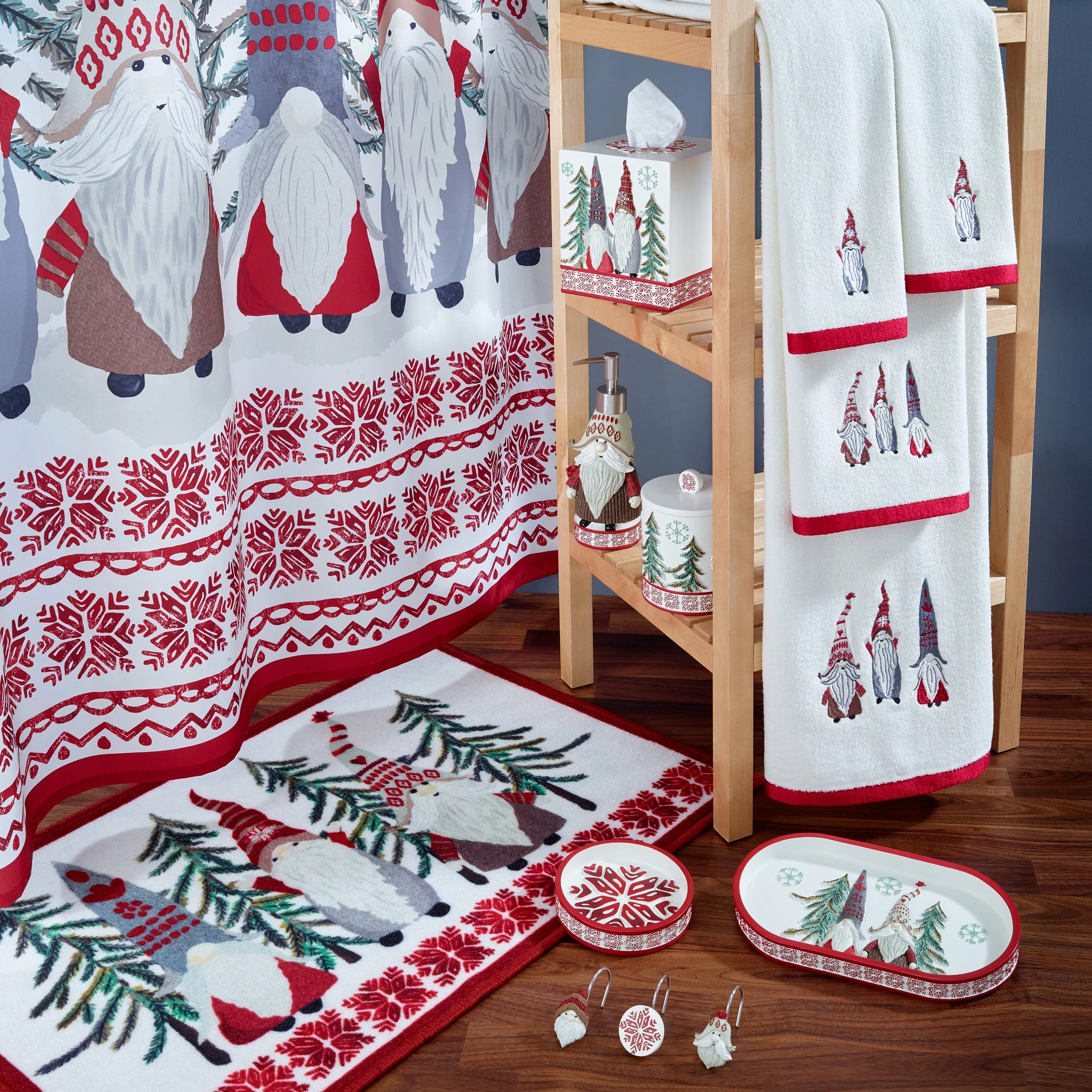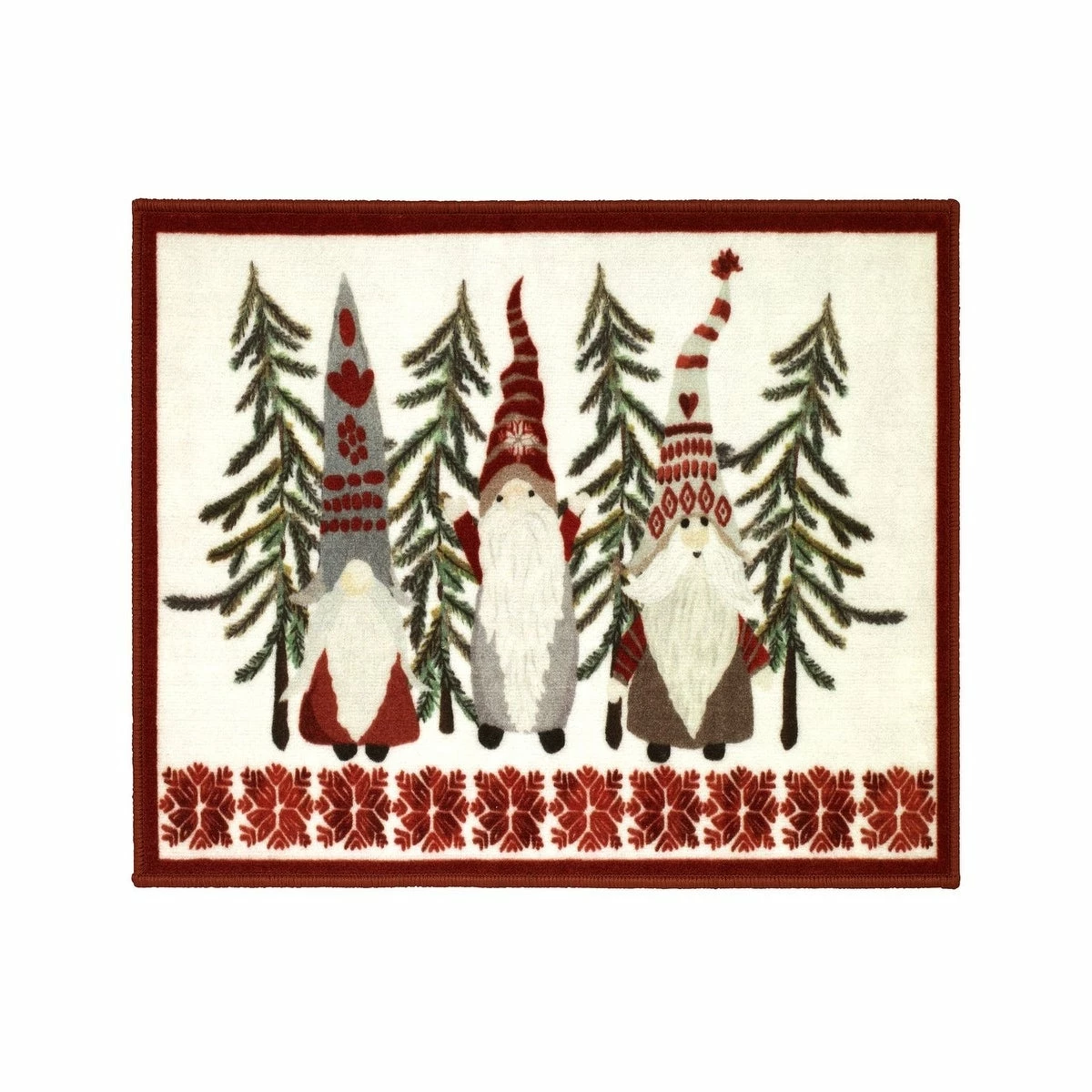 The Avanti Christmas Gnomes Rug features 3 festively attired gnomes with evergreen trees on a white ground. The bottom is bordered with the red and white snowflake motif and a red frame surrounds the entire rug. 20″ x 30″, printed on 100% polyester. Imported.