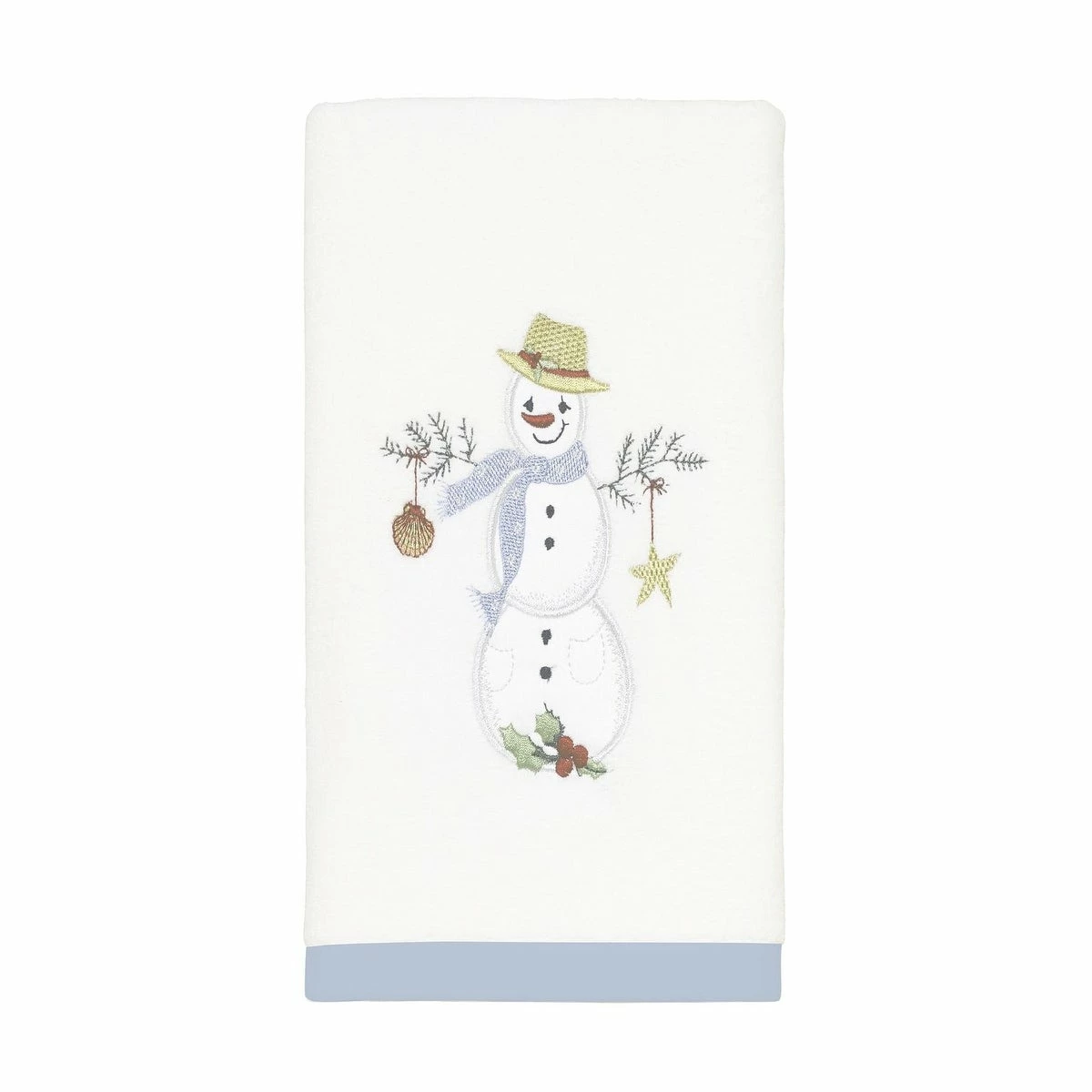 The Avanti Coastal Snowman Hand Towel features an embroidered smiling snowman with a straw hat, blue polka-dotted scarf and holly with seashells on a 100% cotton (exclusive of embellishment and border) white velour towel. The towel is finished with a coordinating light blue polyester border. Imported.