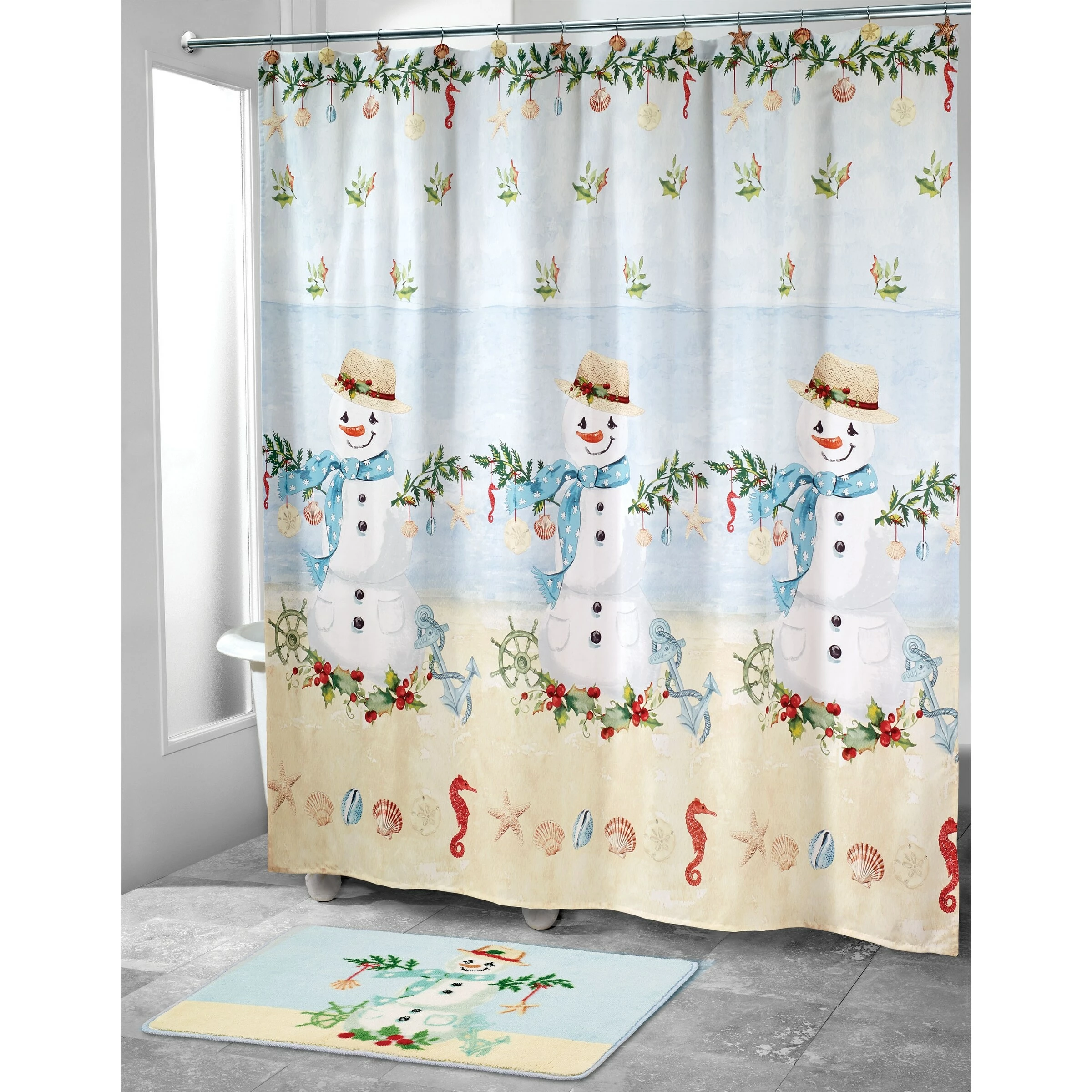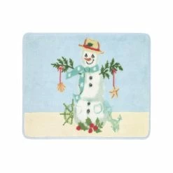 The Avanti Coastal Snowman Rug features the smiling snowman with a straw hat, blue polka-dotted scarf and holly with seashells, a starfish and ship’s wheel. The background is beige at the bottom and sky blue at the top. 20″ x 30″, printed on 100% polyester. Imported.