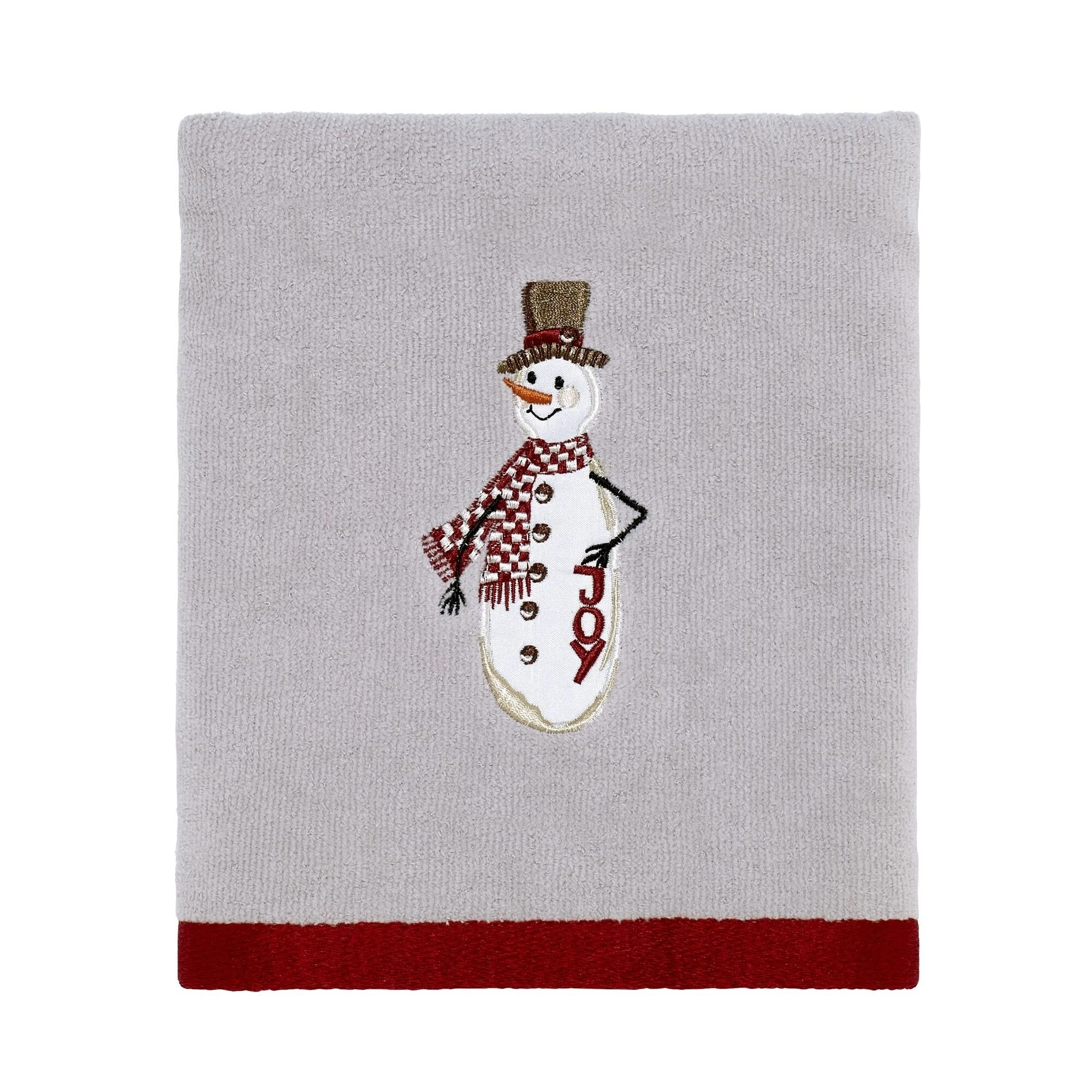 The Avanti Country Friends Decorative Hand Towel features an embroidered happy snowman on a 100% cotton light grey velour towel with a coordinating red polyester border. Imported.