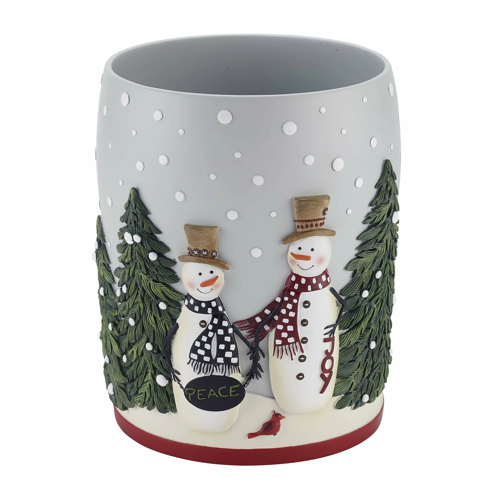 The Avanti Country Friends Wastebasket is decorated with 2 friendly snowmen with scarves and carrot noses, holding a “peace” sign surrounded by two snowy pine trees. The base is grey and the bottom is trimmed with a coordinating red stripe. Made of durable resin, hand painted. Imported.