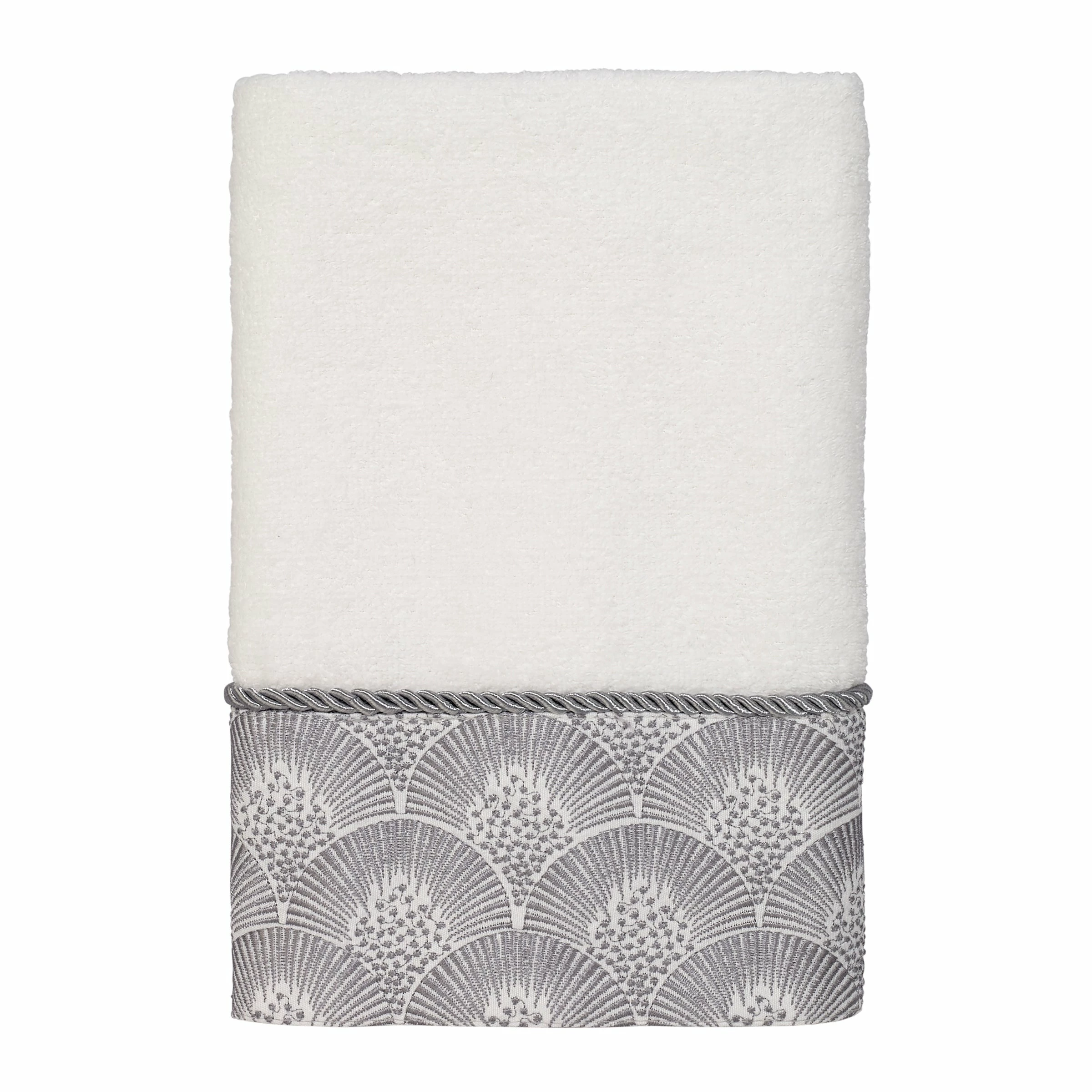 The Avanti Deco Shells Hand Towel features an embroidered band of coordinating silver shells on a tonal fabric attached to a 100% cotton white velour towel. The band is finished with a coordinating rope trim. Imported.