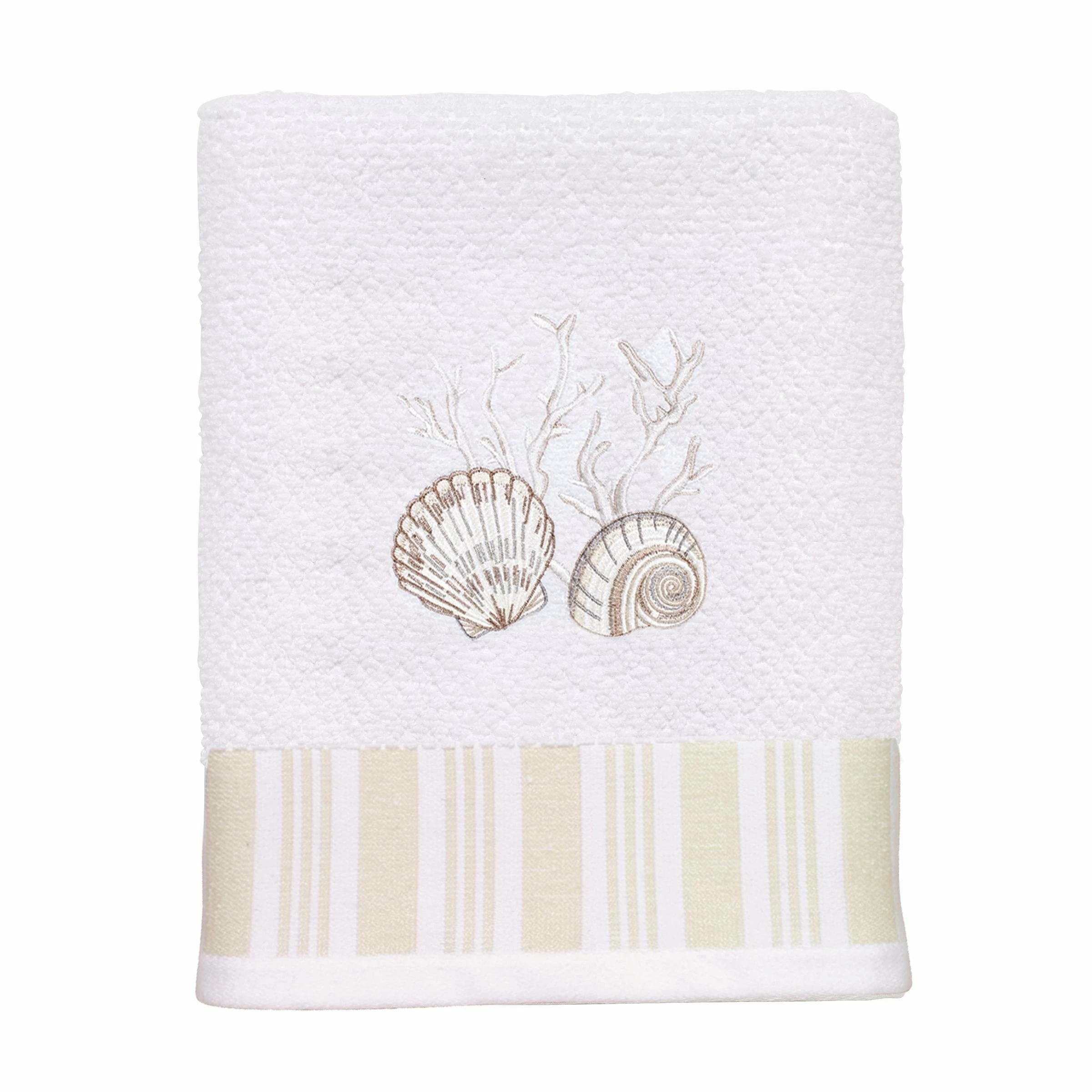 The Avanti Destin Hand Towel features a beautifully embroidered shell and coral design in grey and beige tones on a 100% cotton terry towel. The towel is finished with a beige and white vertical striped border. Imported.