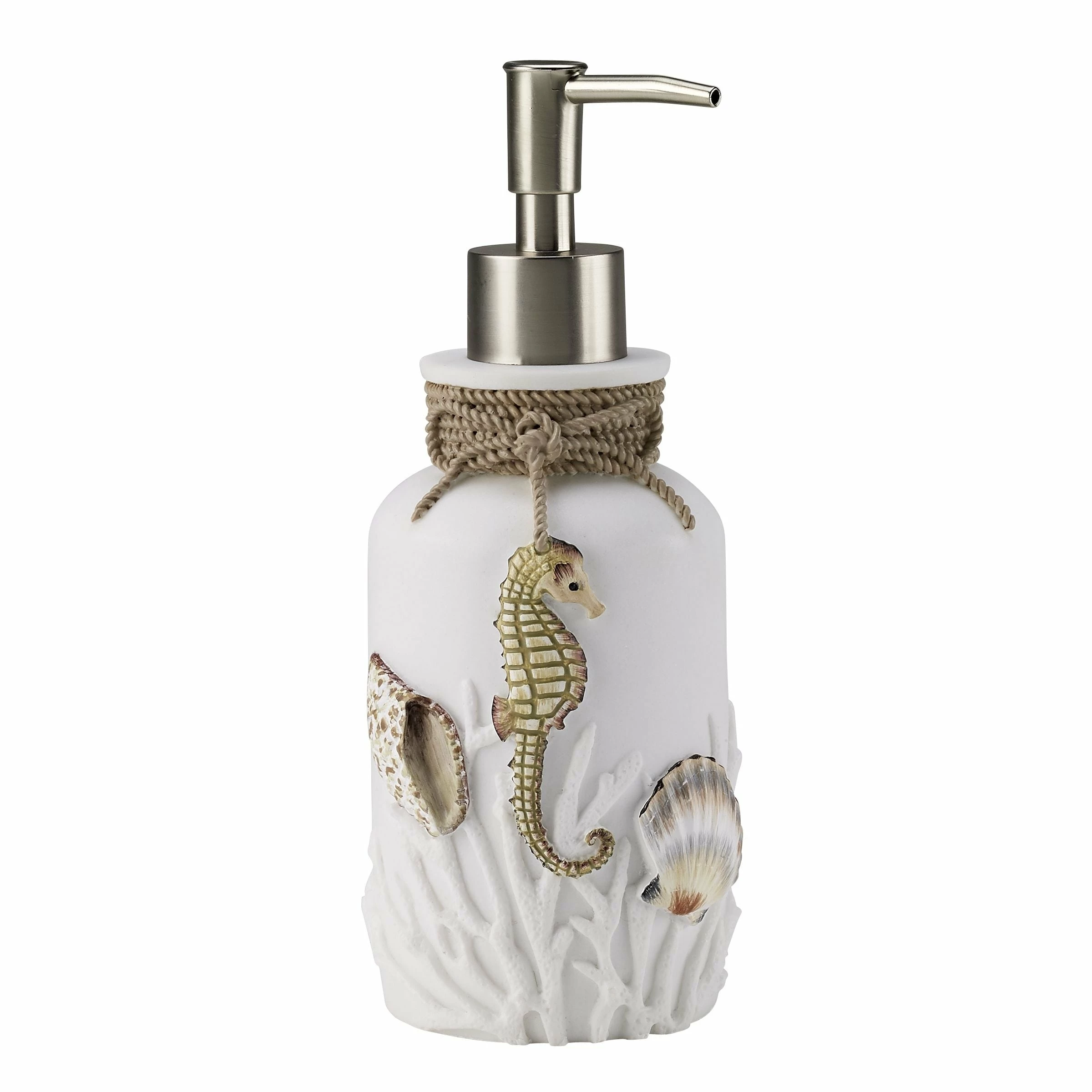 The Avanti Destin Lotion Dispenser features an intricately detailed coral, shell and rope design on a white ground. Hand-painted and crafted in durable resin. Imported.