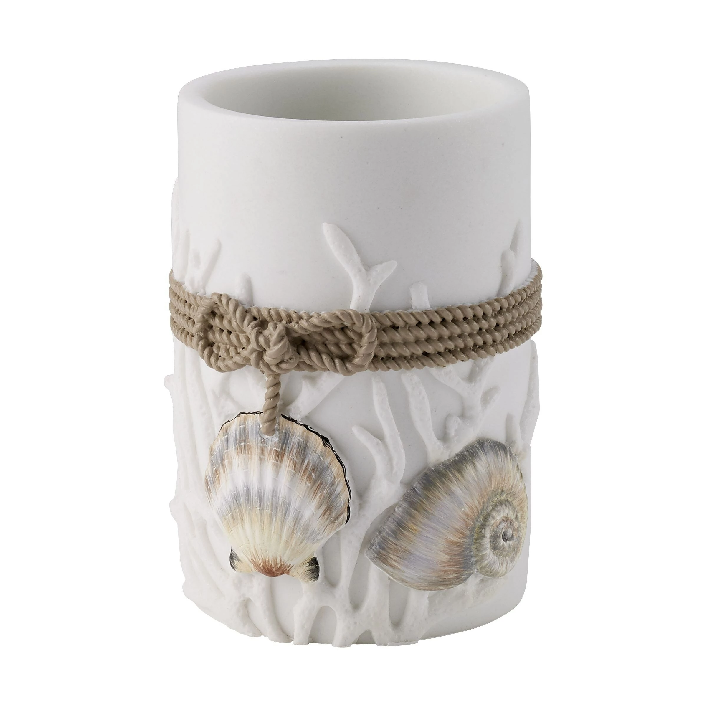 The Avanti Destin Tumbler features an intricately detailed coral, shell and rope design on a white ground. Hand-painted and crafted in durable resin. Imported.