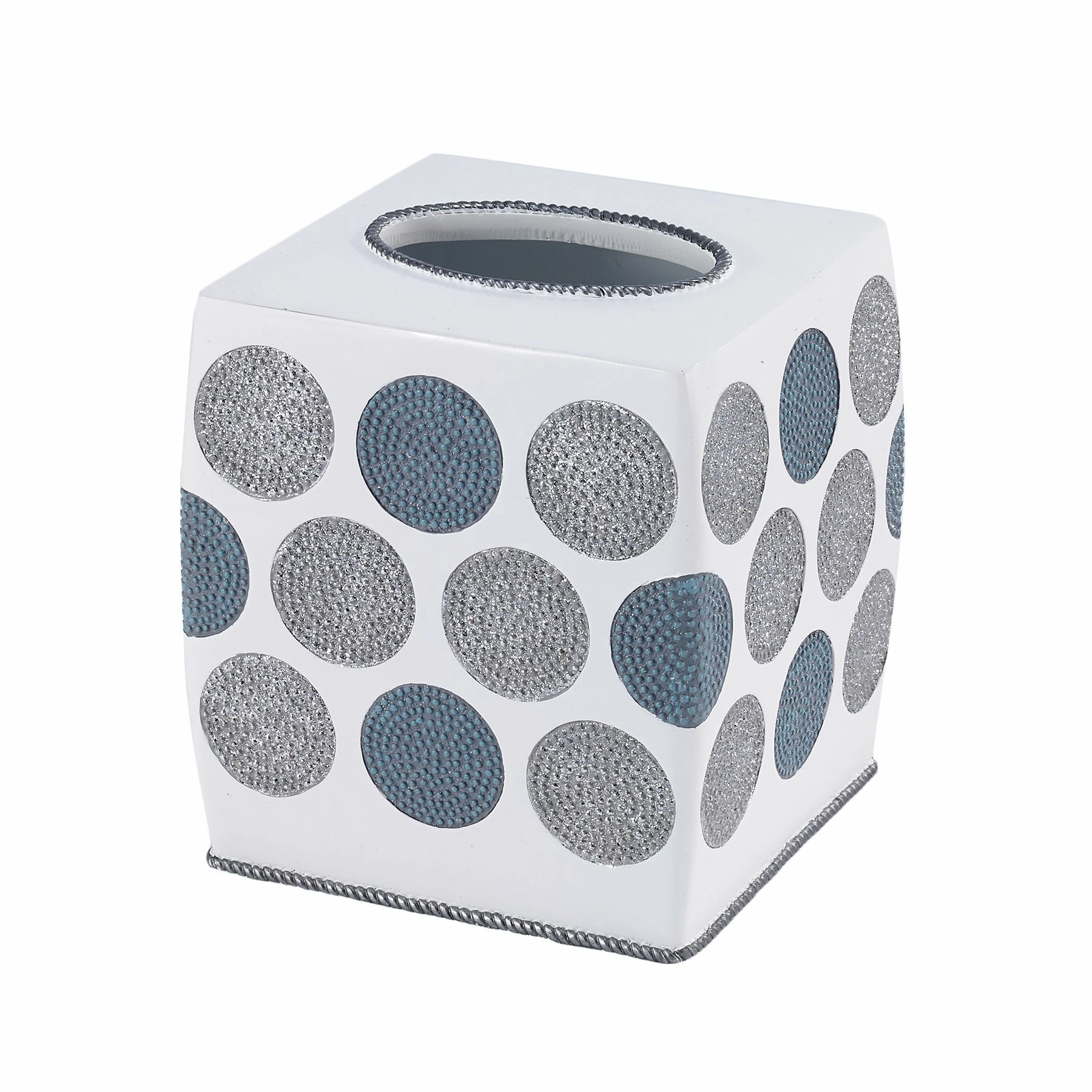 Elevate your tissue box with this decorative cover, which slips over the box to provide an instant facelift. Metallic grey and blue circles march around the sides of the cover, creating a soothing, contemporary vibe. The rigid resin sides protect the tissues from splashes and prevent crushing.