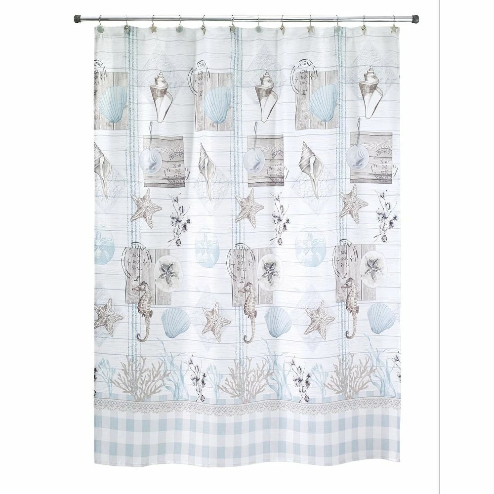 The Farmhouse Shell Printed Shower Curtain features a collection of sea creatures-shells, starfish, seahorses, coral-in pleasing shades of blues and beiges on an off-white, textured shiplap background. The bottom of the curtain is bordered with a blue and white buffalo check with a printed ivory lace trim. 72″ x 72″, polyester. Imported.