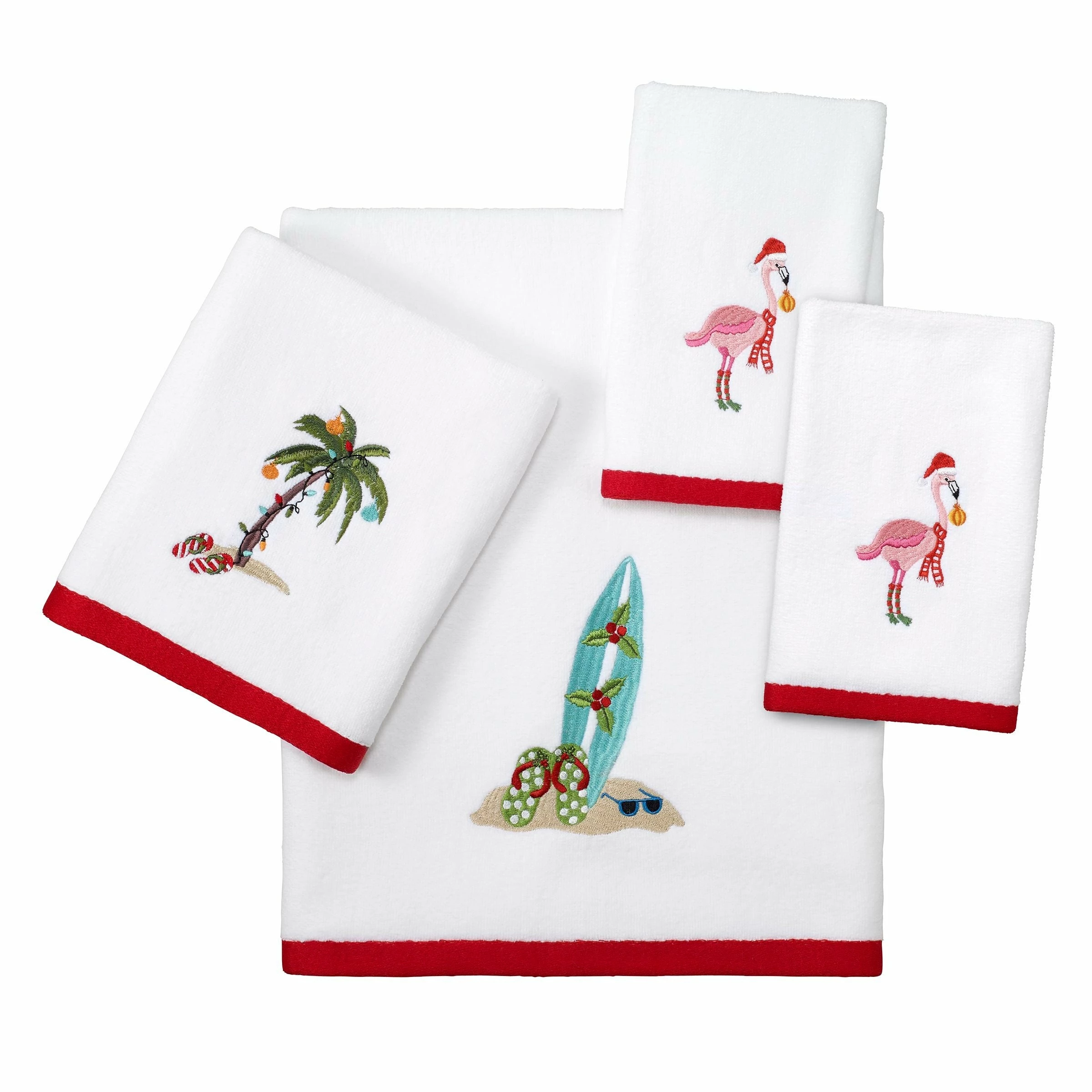 The Avanti Flamingo Jingle Shower Curtain features beautifully printed holiday and coastal icons including flamingos, palm trees, surfboards and flip-flops in festive colors on a white ground. Top is bordered with a string of holiday lights and flip-flops. 100% polyester for easy care, 72″ x 72″.