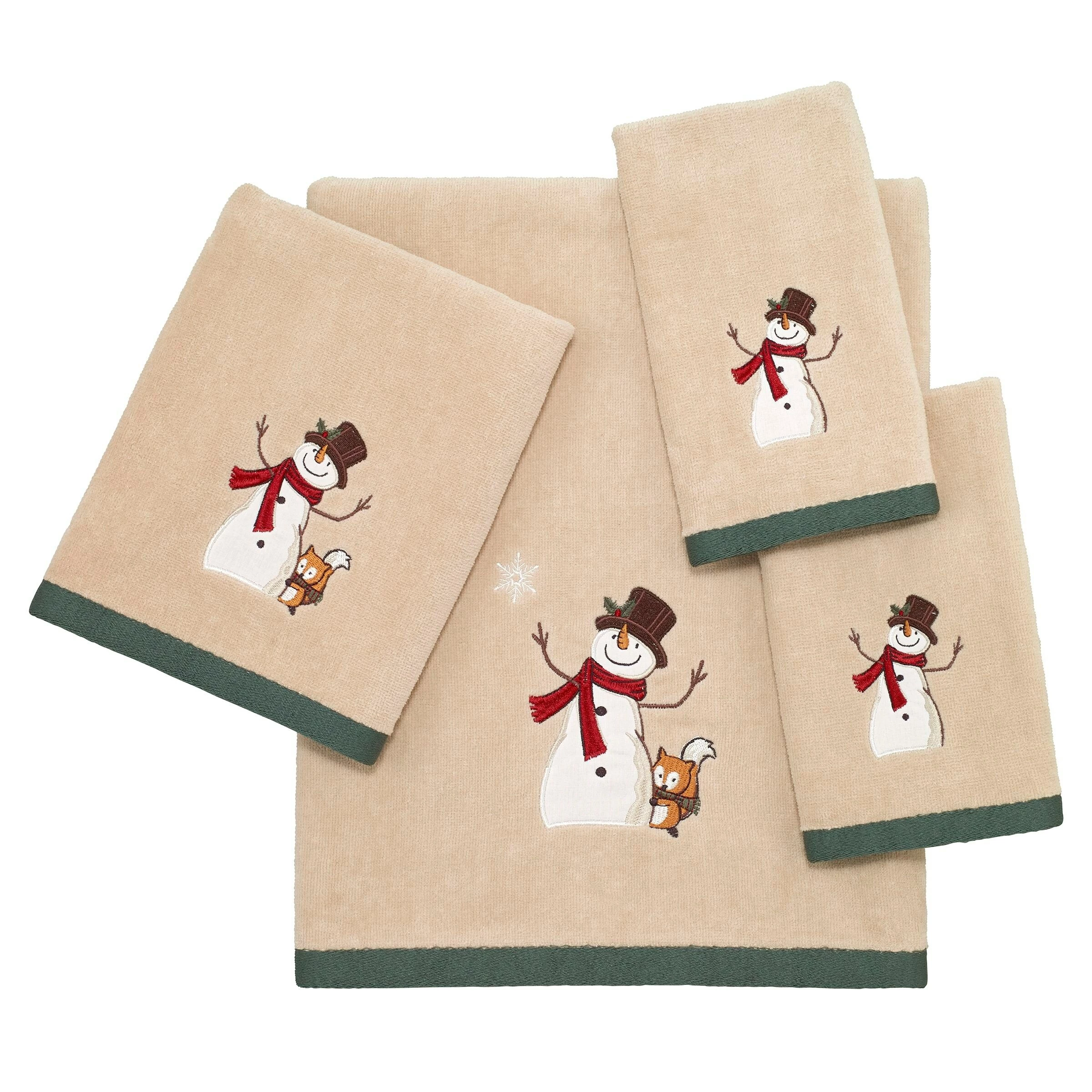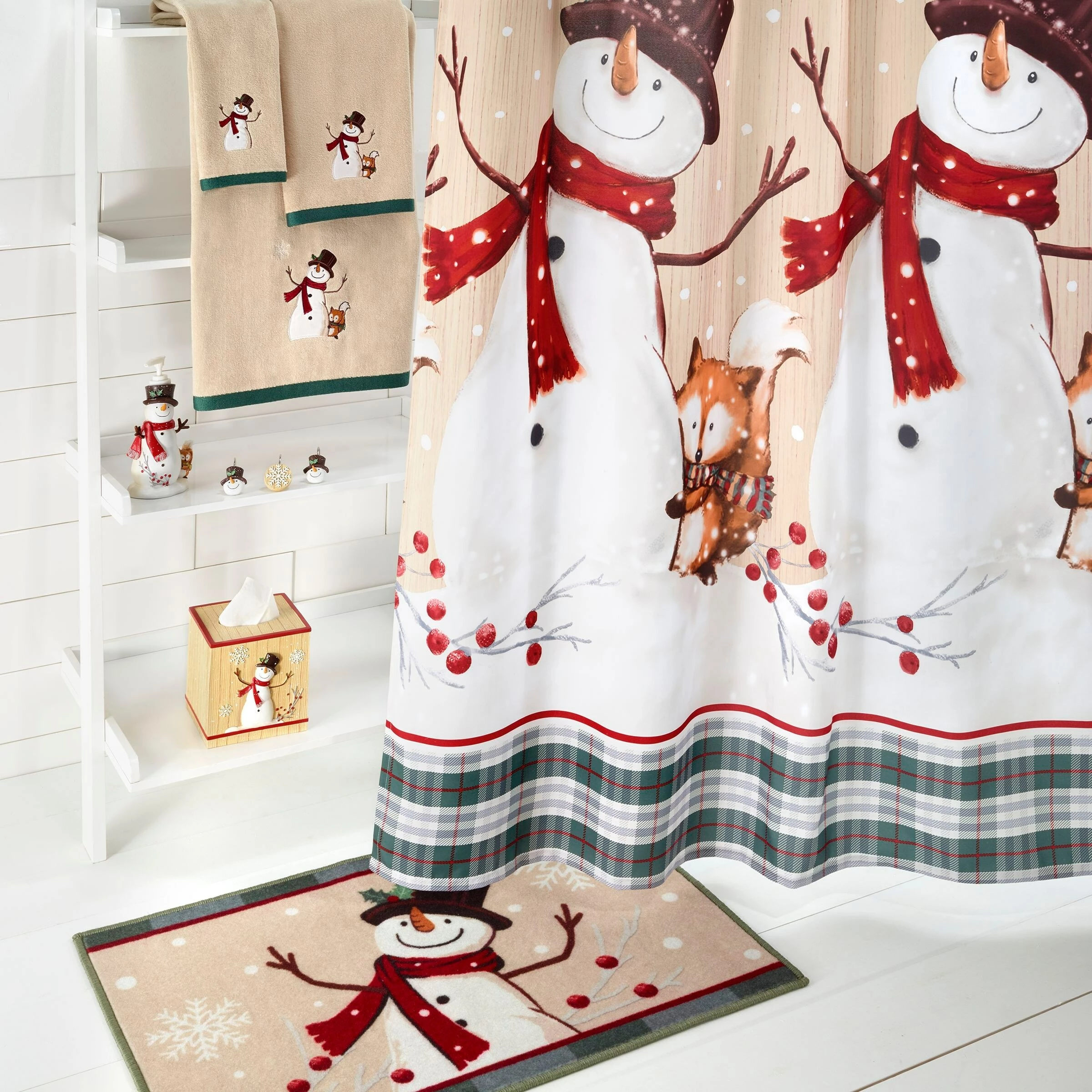 The Avanti Friends Gather Tissue Box Cover features a happy snowman with a red scarf and top hat on a beige faux wood grain. Snowflakes and white dots surround the snowman. 5.7″L x 5.7″W x 6″H, made of durable, hand-painted resin. Imported.