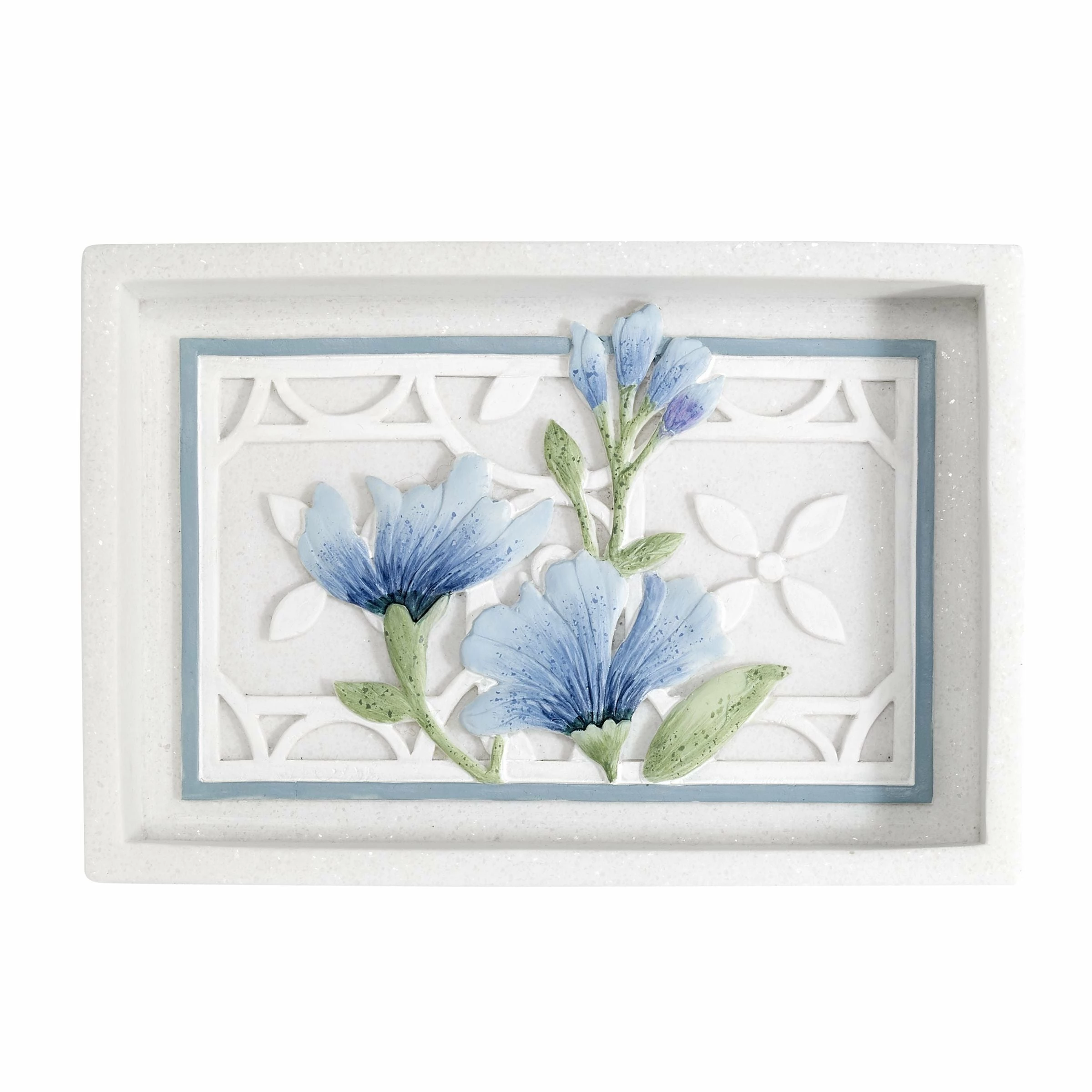 The Avanti Garden View Collection Soap Dish features a group of fresh spring blossoms in various shades of blue with green stems on a white, debossed trellis design framed with a medium blue border. Realistically created in hand-painted resin. Coordinating pieces available. Imported.