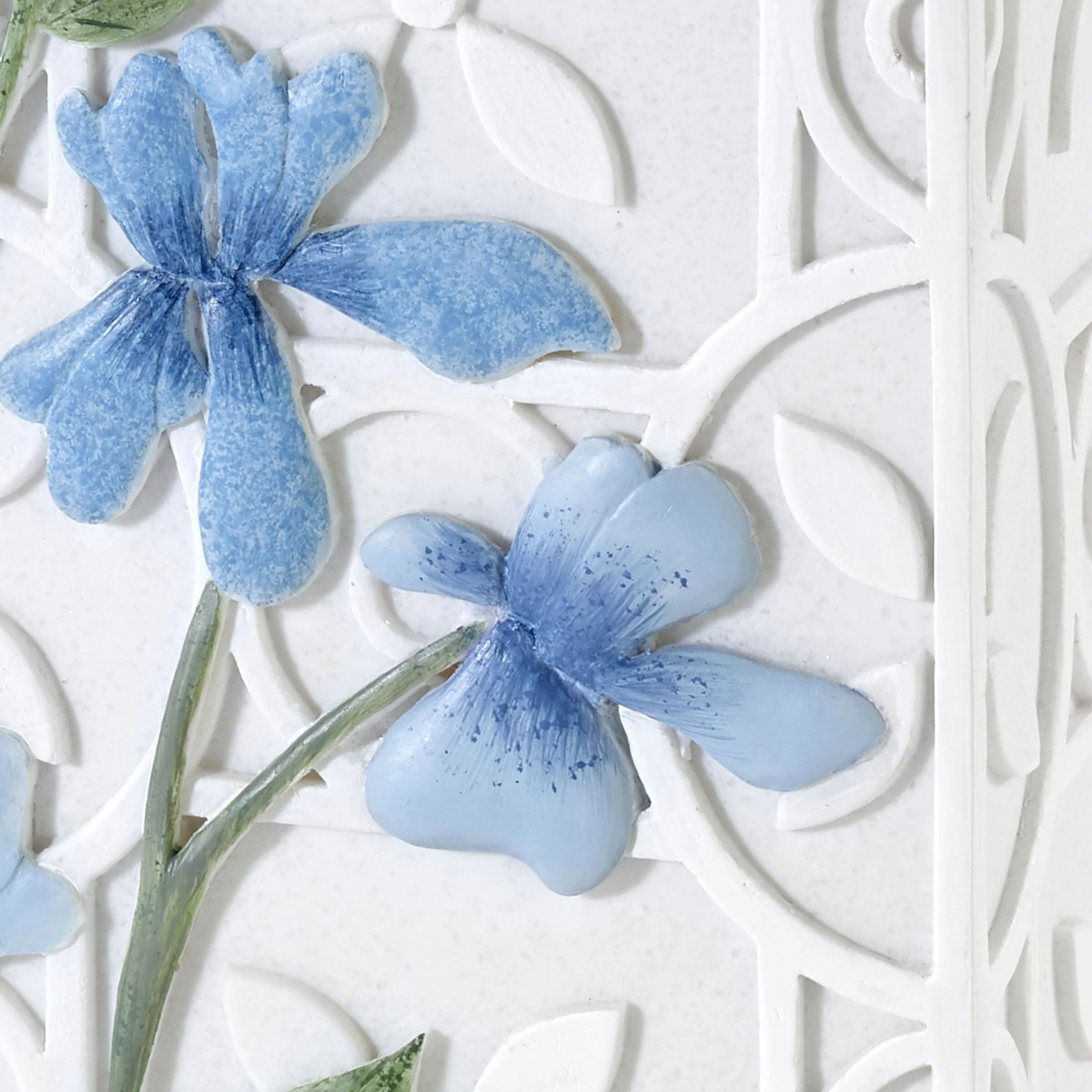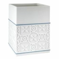 The Avanti Garden View Collection Wastebasket features a group of fresh spring blossoms in various shades of blue with green stems on a white, debossed trellis design framed with a medium blue border. Made of hand-painted resin. Coordinating shower curtain, towels and rug available. Imported.
