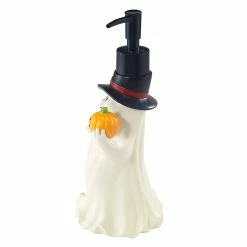 The Avanti Happy Ghost Decorative Lotion/ Soap/ Sanitizer Dispenser is a smiling, well-dressed ghost holding a pumpkin in one hand and trick-or-treat bag in the other. A red bow-tie and black hat with red ribbon complete the look. Made of durable, hand-painted resin, 3.9″L x 3.7″W x 8.9″H.