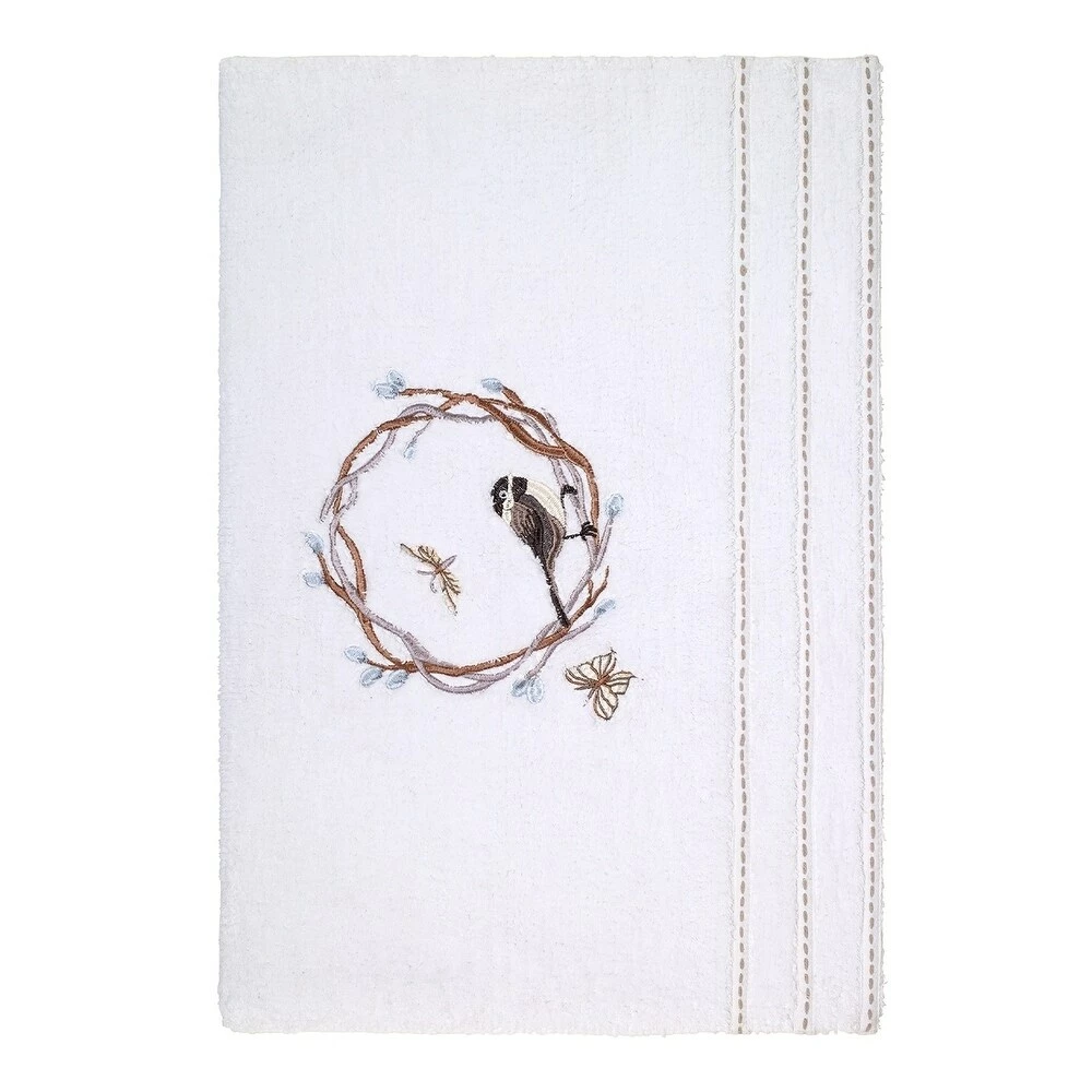 The Avanti Live Simply Rug is tufted in 100% cotton embroidered with a bird perched on a twig wreath and butterflies. Three taupe broken horizontal lines border the bottom. 20″ x 30″. Imported.