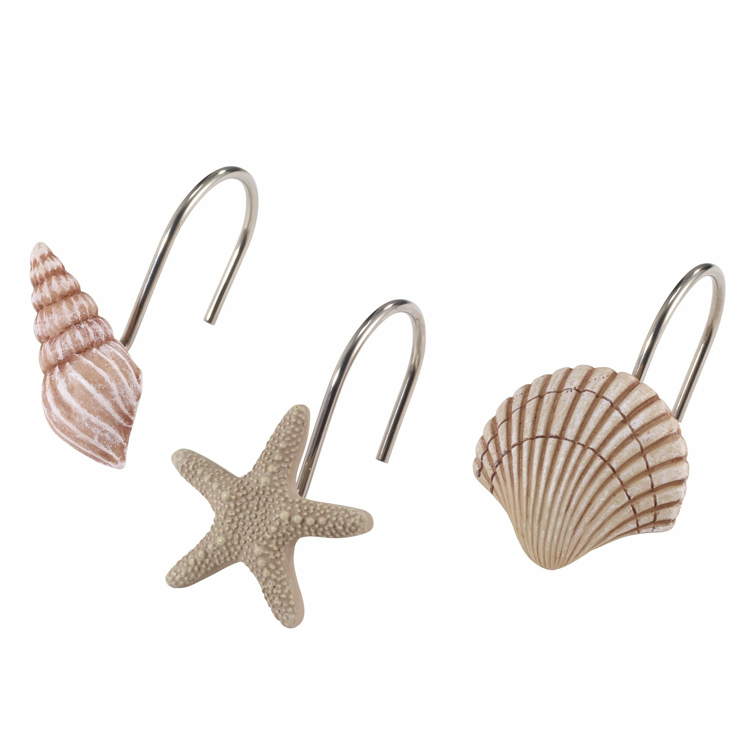 The Avanti Macrame Shells Shower Curtain Hooks features 3 different icons pulled from the shower curtain-fan shell, spiral shell and starfish-in shades of beige and brown. Set of 12, 4 of each design. Made of durable, hand-painted resin for long-lasting use.