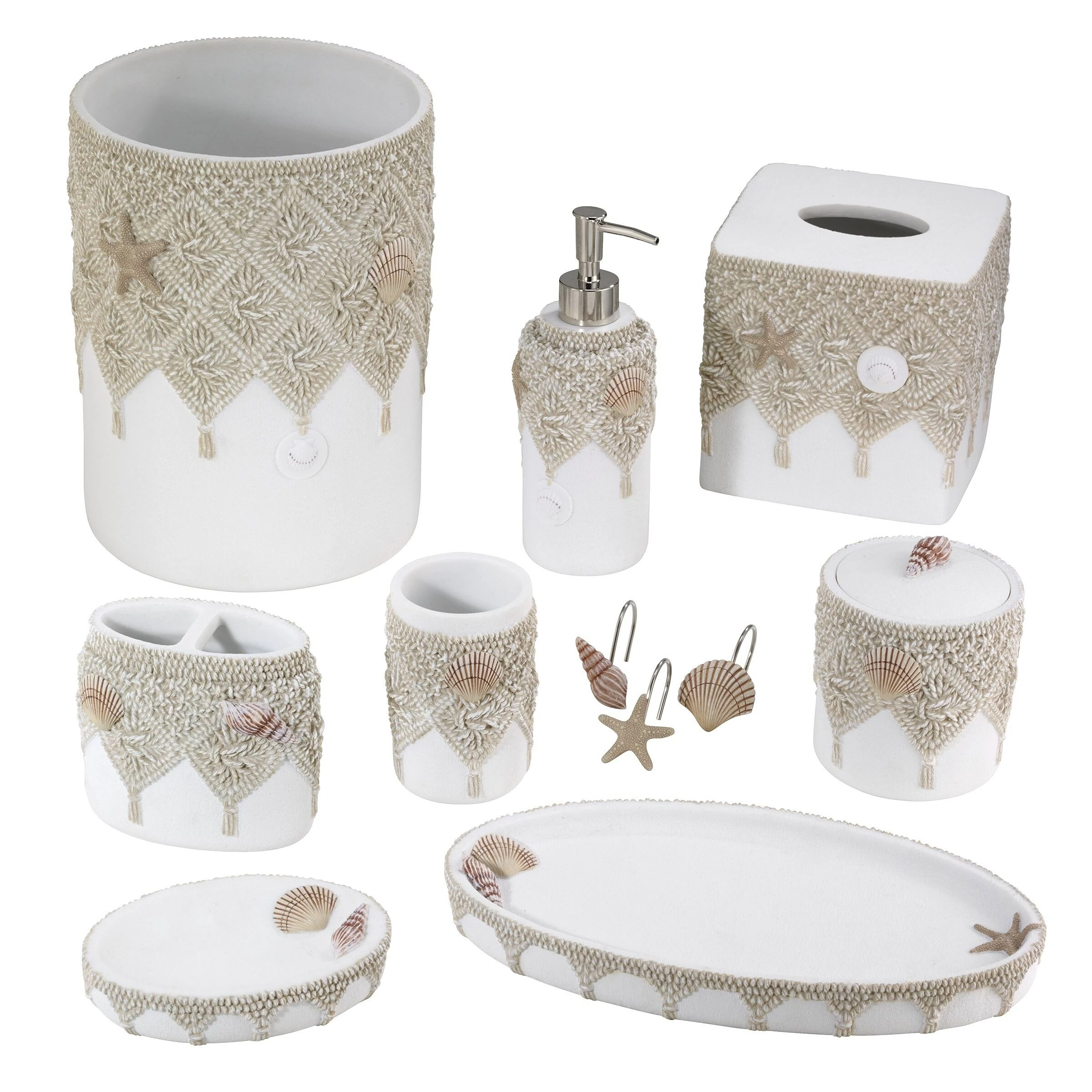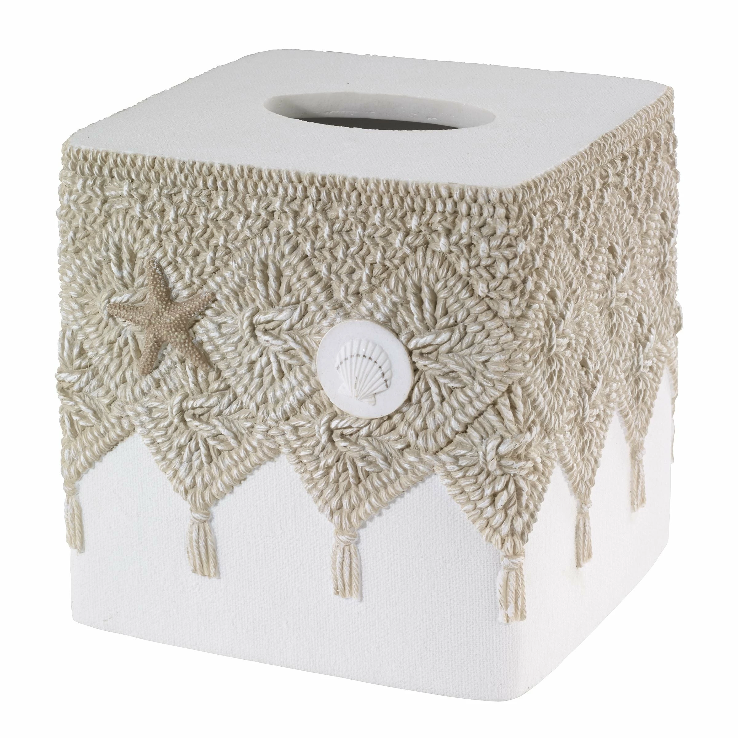 The Avanti Macrame Shells Tissue Box Cover is decorated with life-like linen-colored faux macrame detail with tassels, starfish and shells on the top half. The bottom is a textured off-white ground. Made of durable, hand-painted resin, wipe clean.