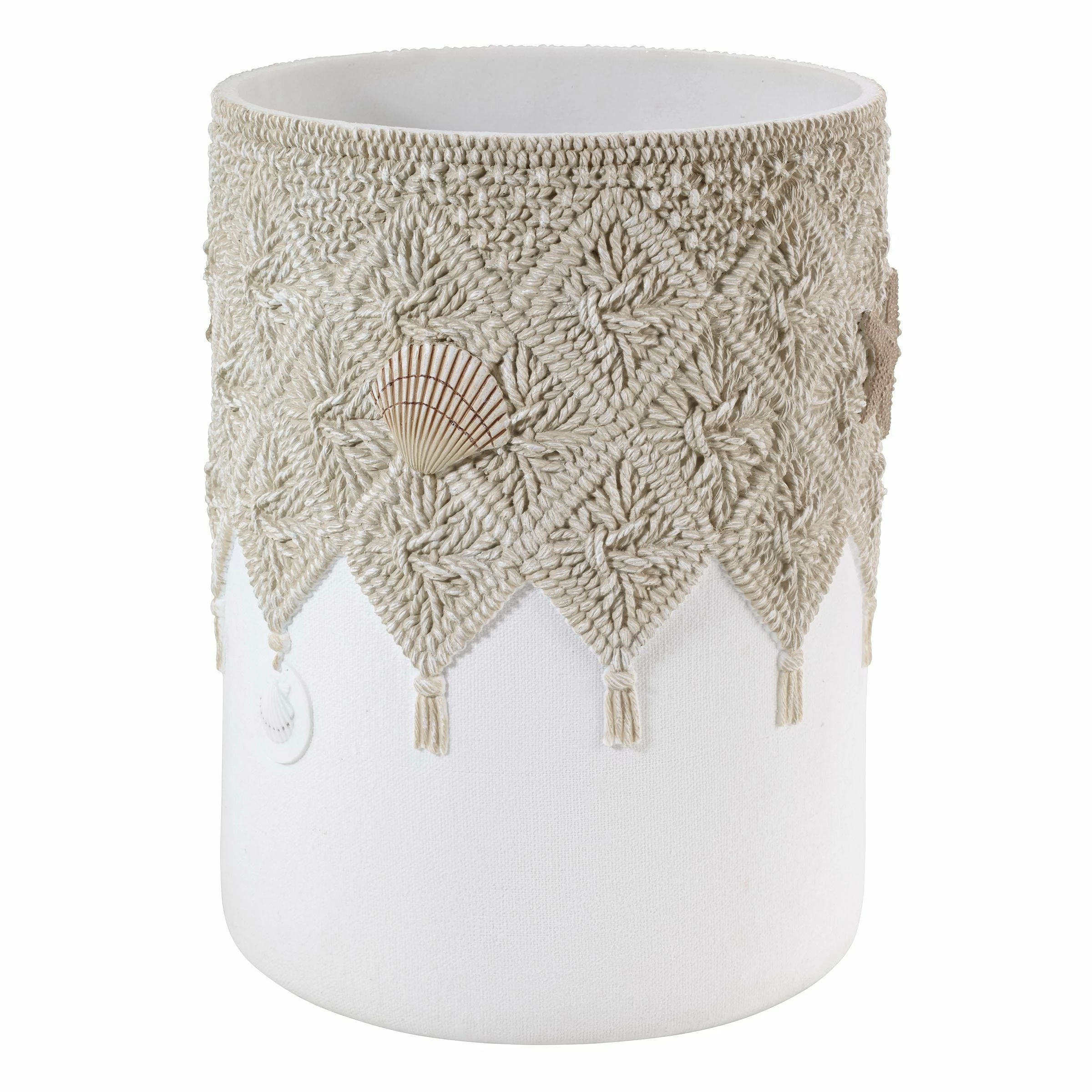 The Avanti Macrame Shells Round Wastebasket is decorated with life-like linen-colored faux macrame detail with tassels, starfish and shells on the top half. The bottom is a textured off-white ground. Made of durable, hand-painted resin, wipe clean.