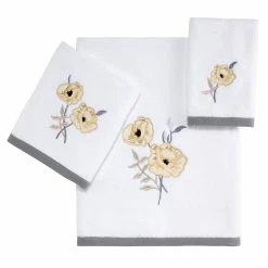 The Avanti Marielle 3 Pc. Decorative Towel Set features large embroidered yellow flowers with grey stems on a white ground. The 100% cotton white velour towel is finished with a coordinating woven grey dobby border. Set includes one each of bath, hand and fingertip towel.