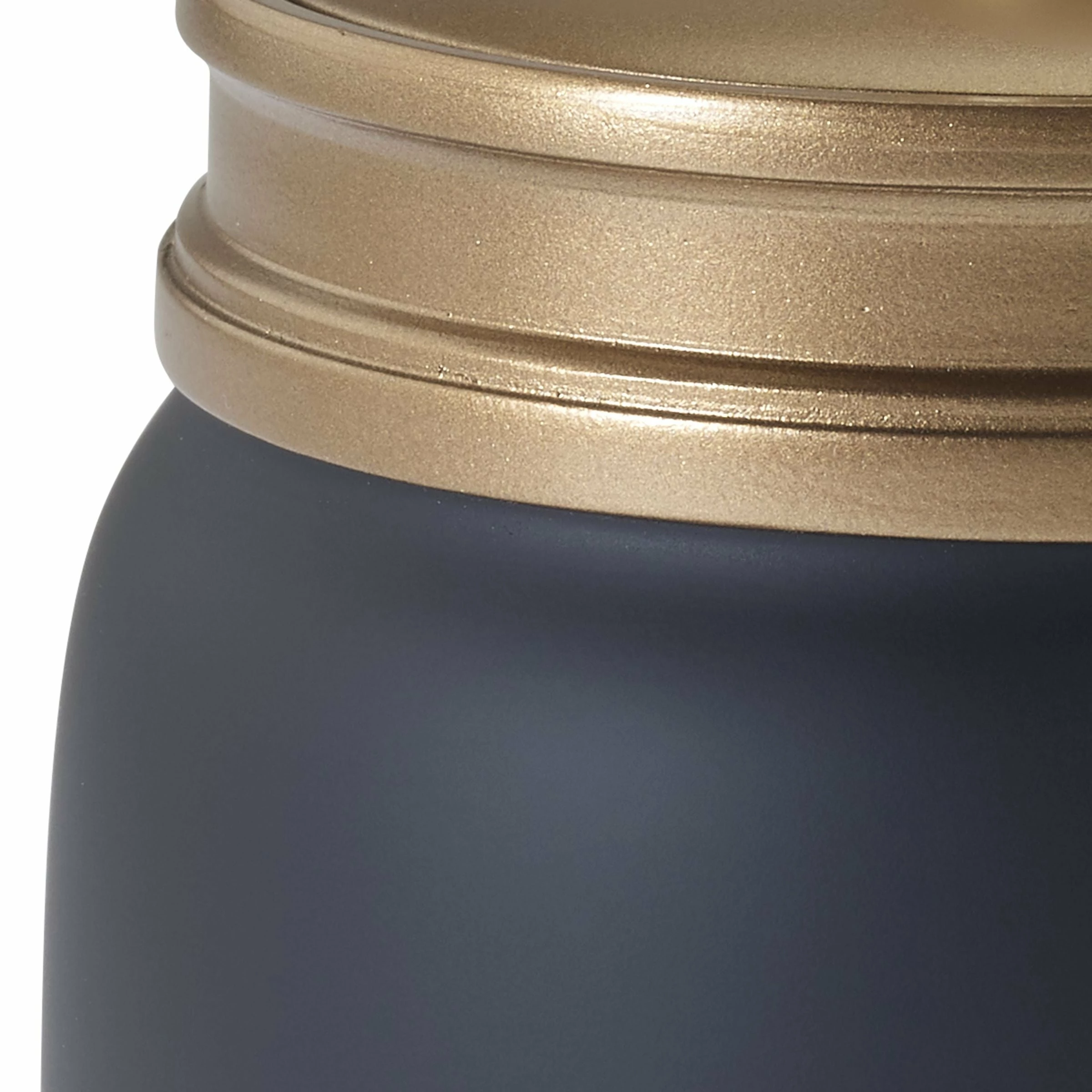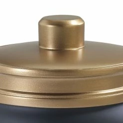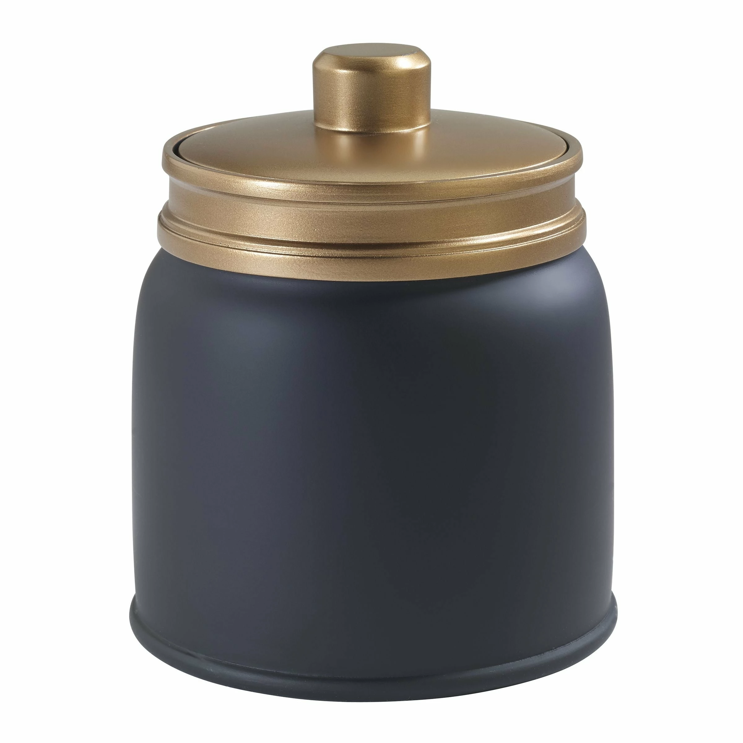 The Avanti Memphis Covered Jar delivers a smooth matte black finish with beveled industrial accents in vintage gold metallic. Crafted in durable resin for long life. Full coordinating bath accessory collection is available. Imported. ย ย ย