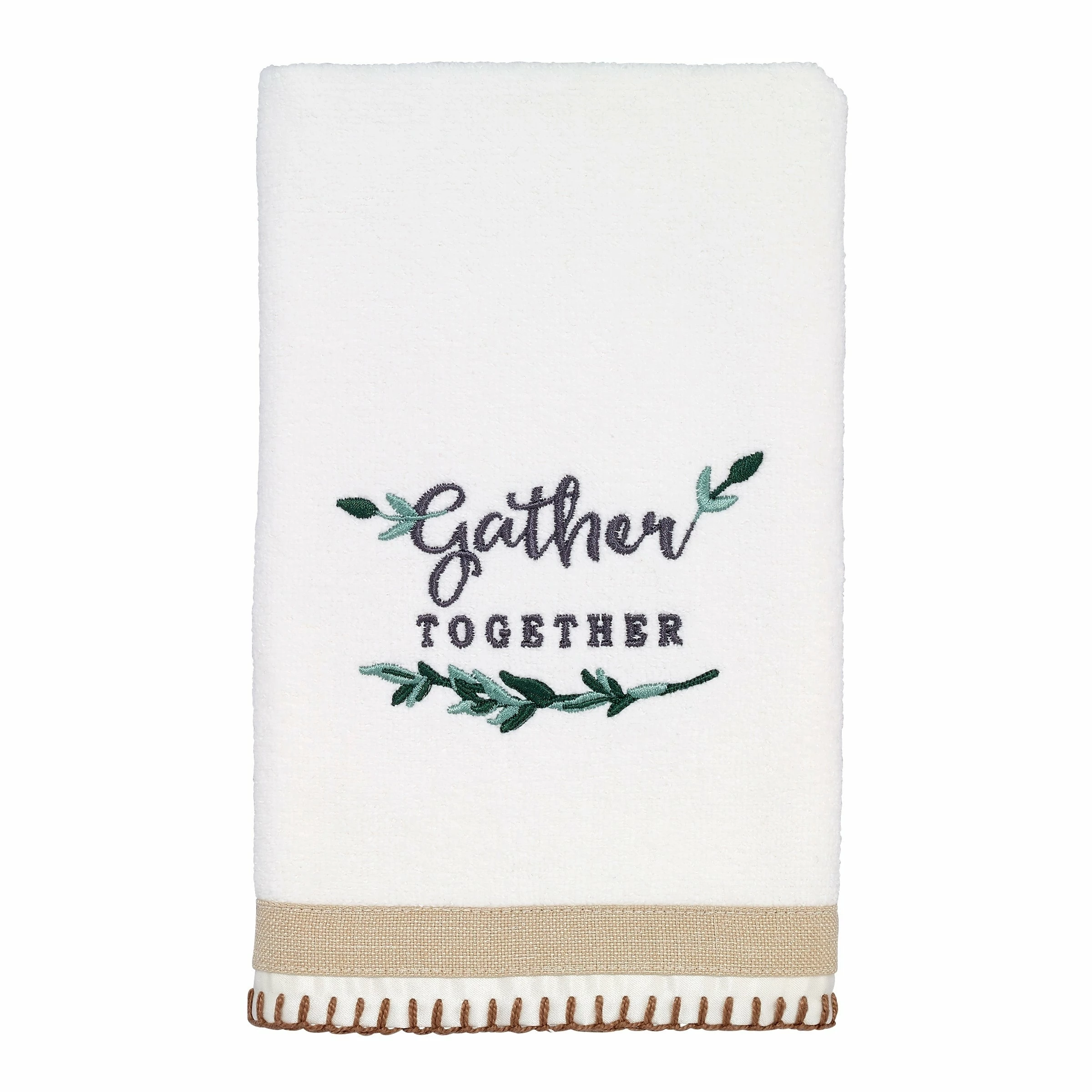 The Avanti Modern Farmhouse Hand Towel is embroidered with “Gather Together” on a 100% cotton white towel. Finishing the look is a two-tone coordinating fabric border with whip-stitching. Embroidered in the USA, towel imported.