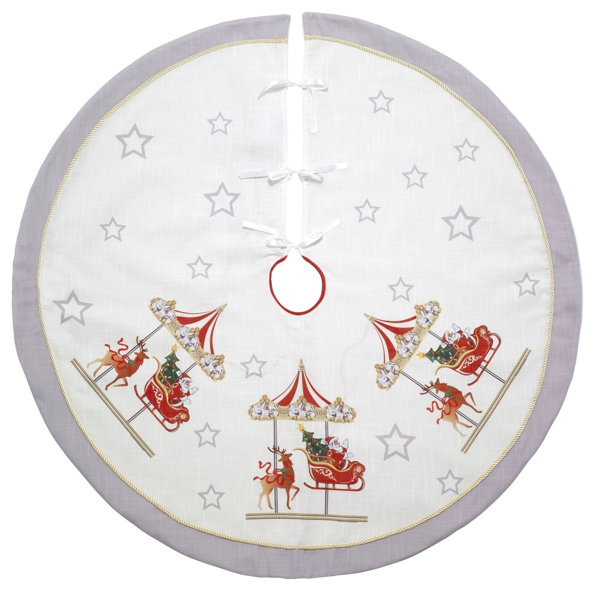 Mr. ย ย Christmasยฎ Carousel Tree Skirt with Music and Lights picks up on the classic ย ย design with a beautifully printed carousel scene surrounded by silver stars ย ย on a textured ivory ground. The border is made of a textured grey fabric, ย ย finished with a gold braided rope trim. Multi-colored lights and “Jingle ย ย Bells” add holiday joy to your home.3 AAA batteries not included. Imported. Mr. Christmasยฎ, since 1933. ย ย ย ย