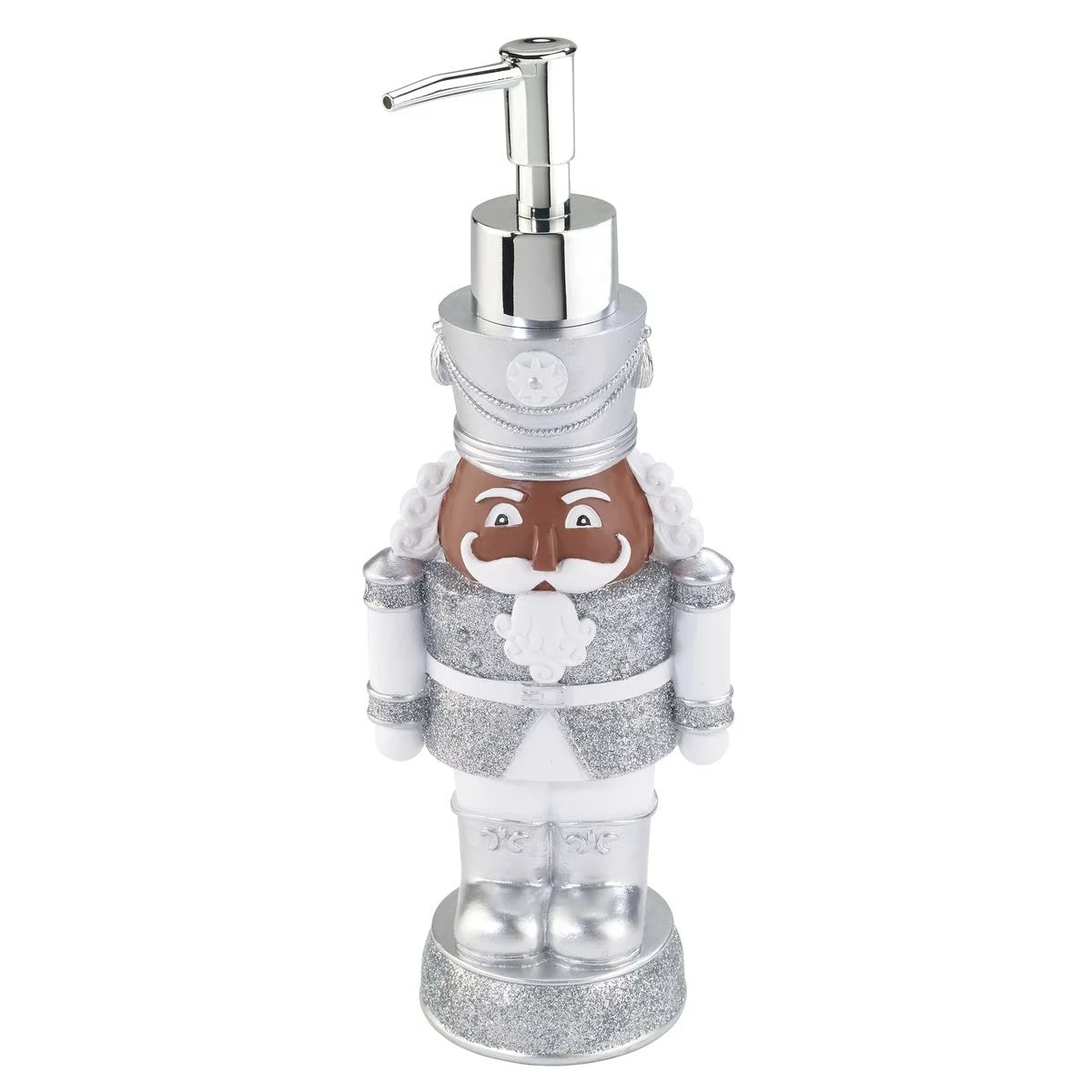 The Avanti African American Silver Nutcracker Lotion / Soap / Sanitizer Dispenser is festively attired in a silver with glitter suit and a white mustache. He has a shiny coordinating shiny silver pump. Made of durable, hand-painted resin, measures “2.56 L x 3.35” W x 8.7″H . Imported.
