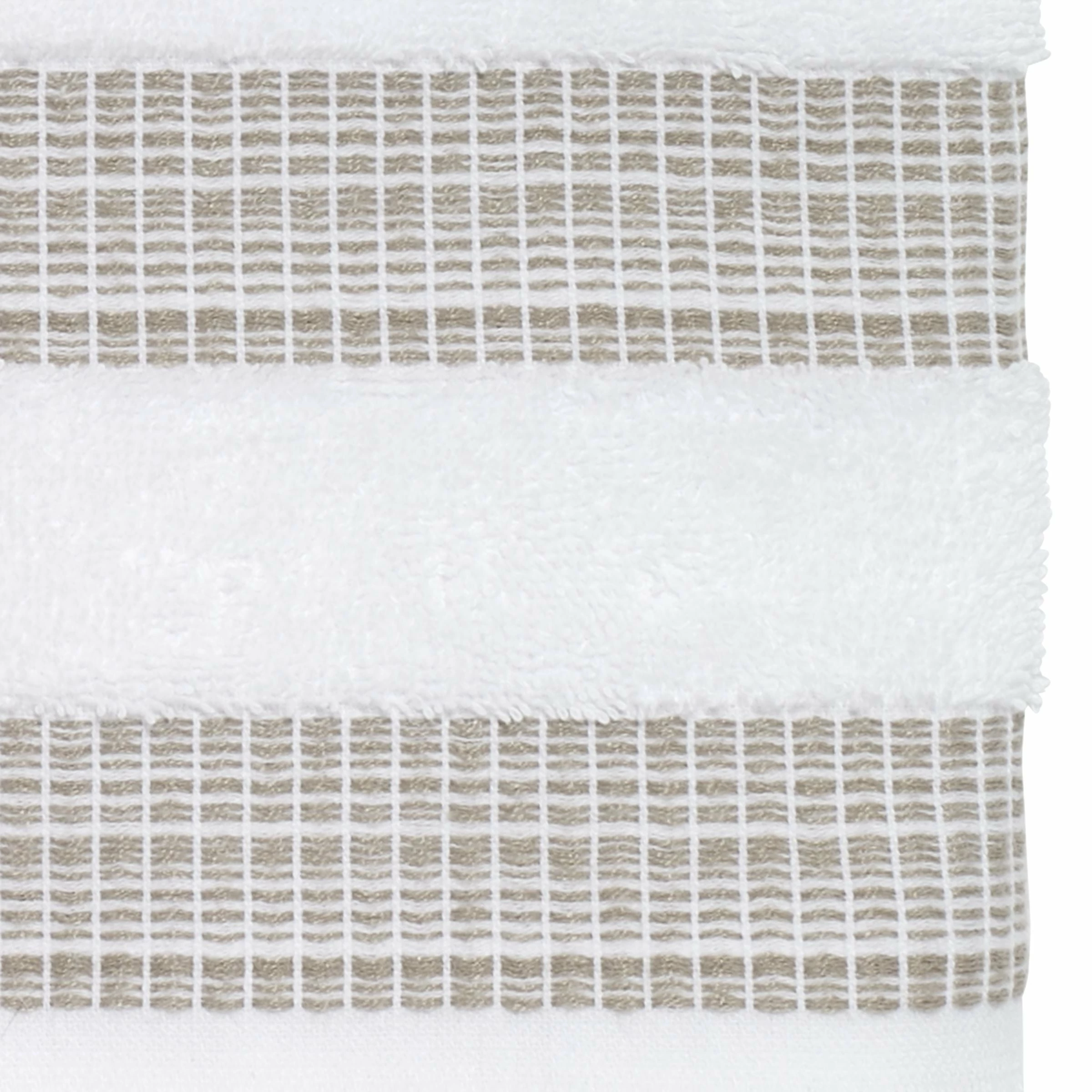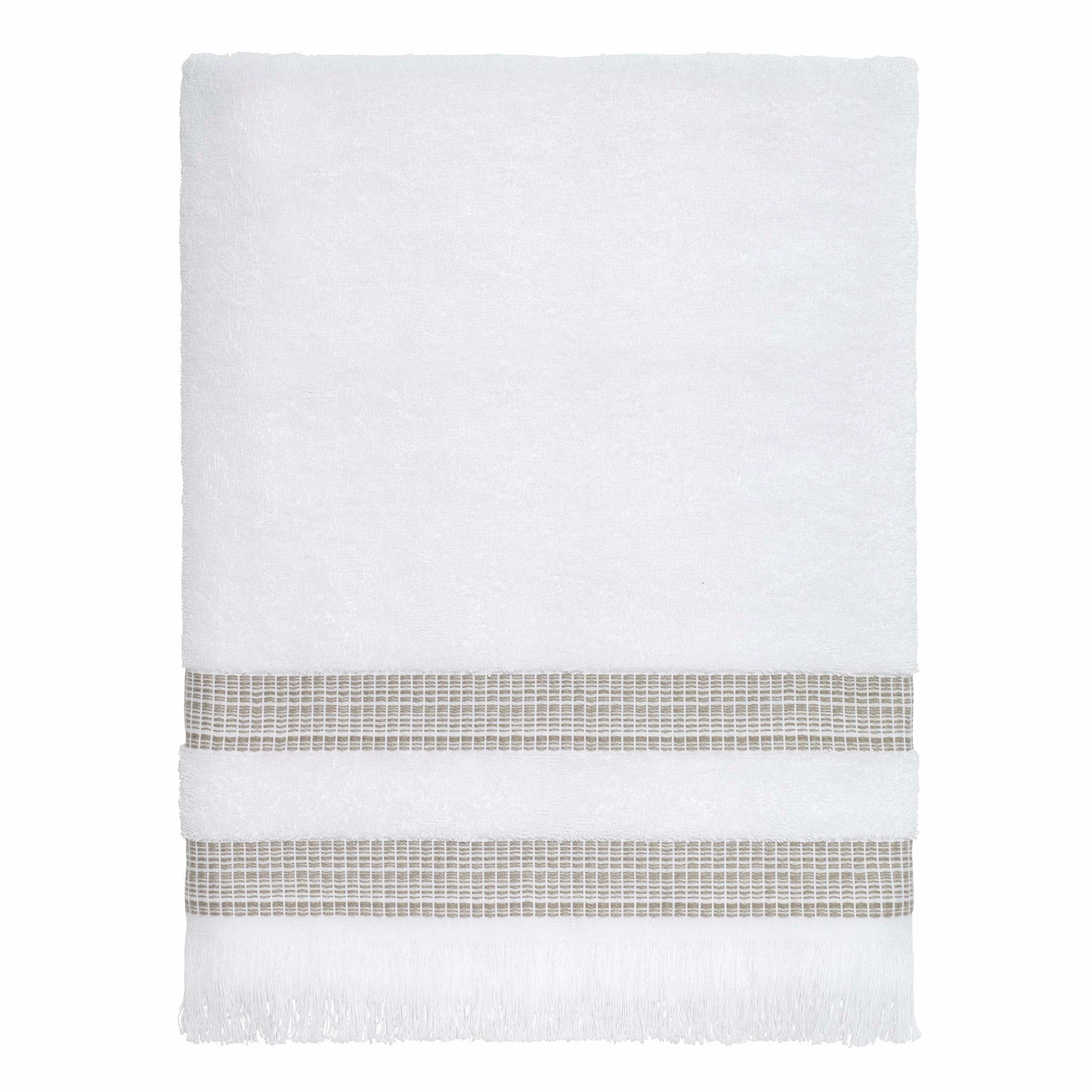 The Avanti Oasis Linen Bath Towel features 2 sections on the white ground with Β Β linen light-to-dark space-dyed yarns. 27 x 54 in. terry towel is finished with a 1.8 in. fringe. Made of Β 100% ringspun cotton for soft feel, superior absorbency. Imported. Β Β Β Β