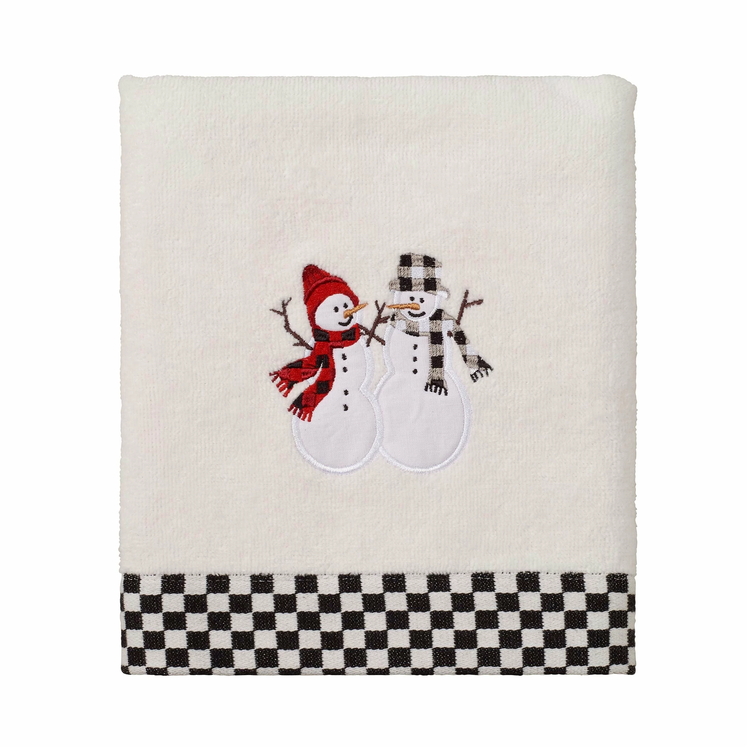 The Avanti Rustic Pals Embellished Hand Towel is decorated with 2 embroidered snowmen with black and white and black and red hats and scarves . The 100% cotton linen velour towel is finished with a black and white check polyester border. 16″ x 28″, machine washable.