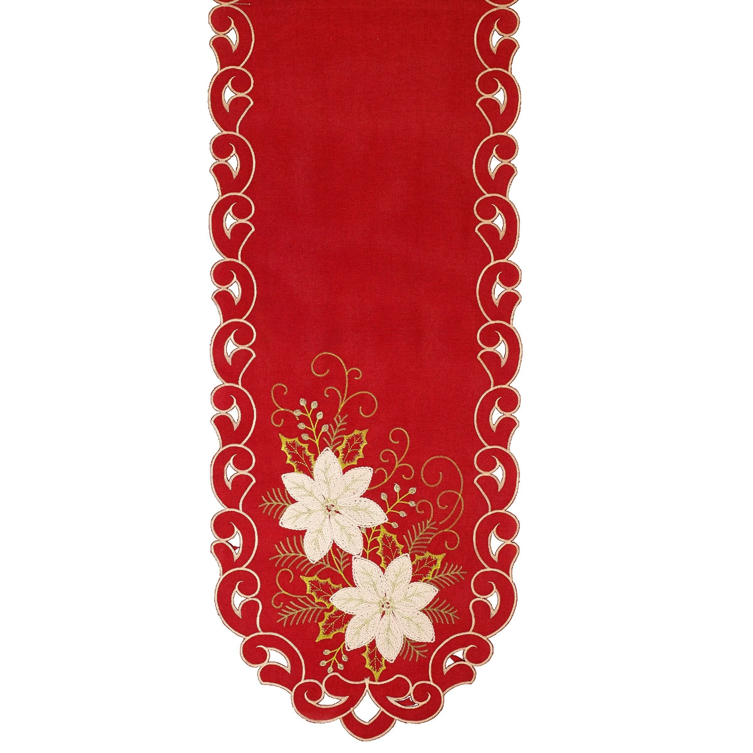 The Avanti Scroll Poinsettia 16″ x 72″ Runner is beautifully decorated with embroidered white poinsettias with gold scrollwork and green branches on both ends. Cutwork with gold embroidery thread forms a border around the runner. The red basecloth is 100% polyester.