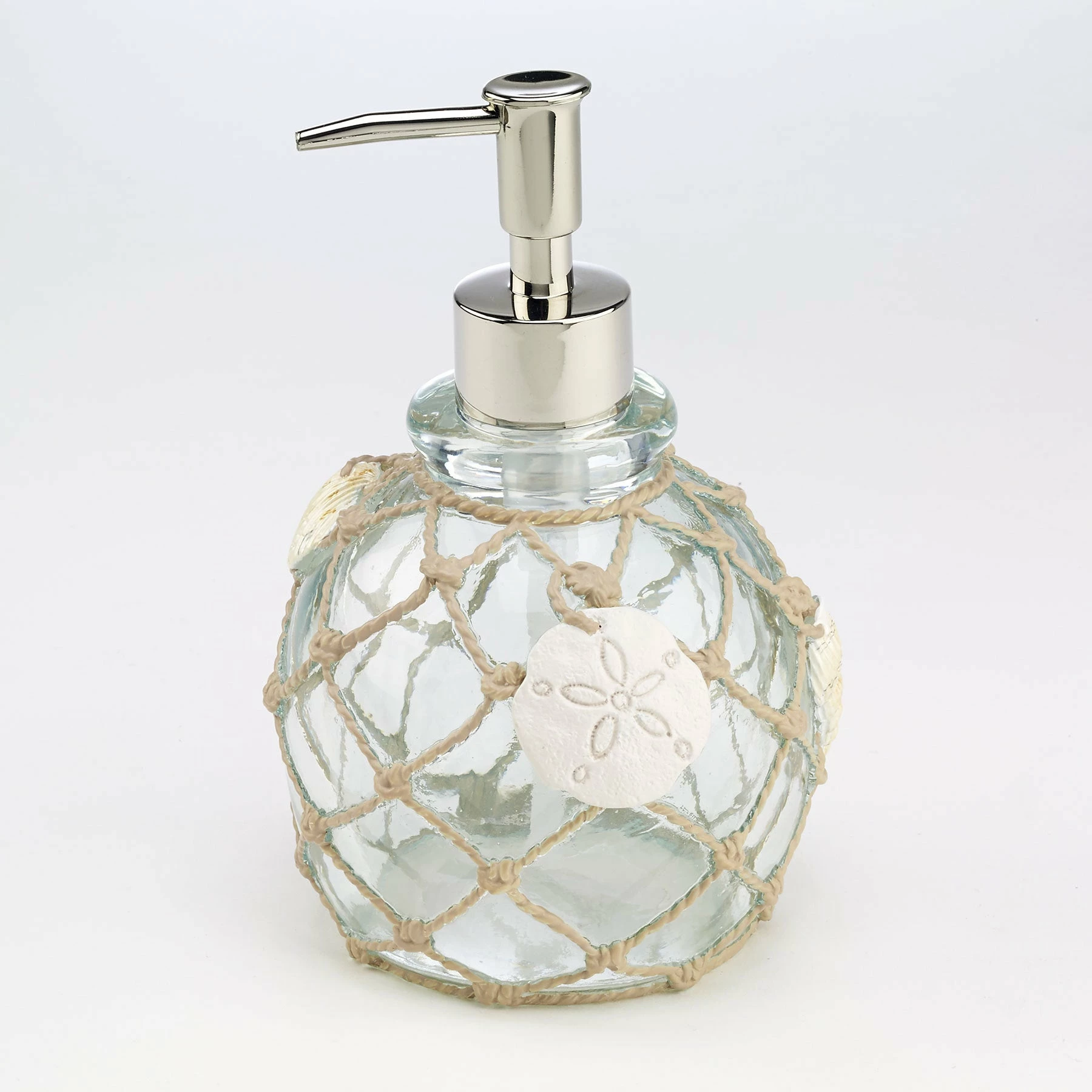 Complement your coastal chic bathroom with this Sea Glass pump dispenser by Avanti Linens. The beautiful glass-look resin base is durable enough to withstand many re-fillings and the fishing-net inspired rope covering and sand dollar accent adds a whimsical yet stylish accent to your bathroom vanity.