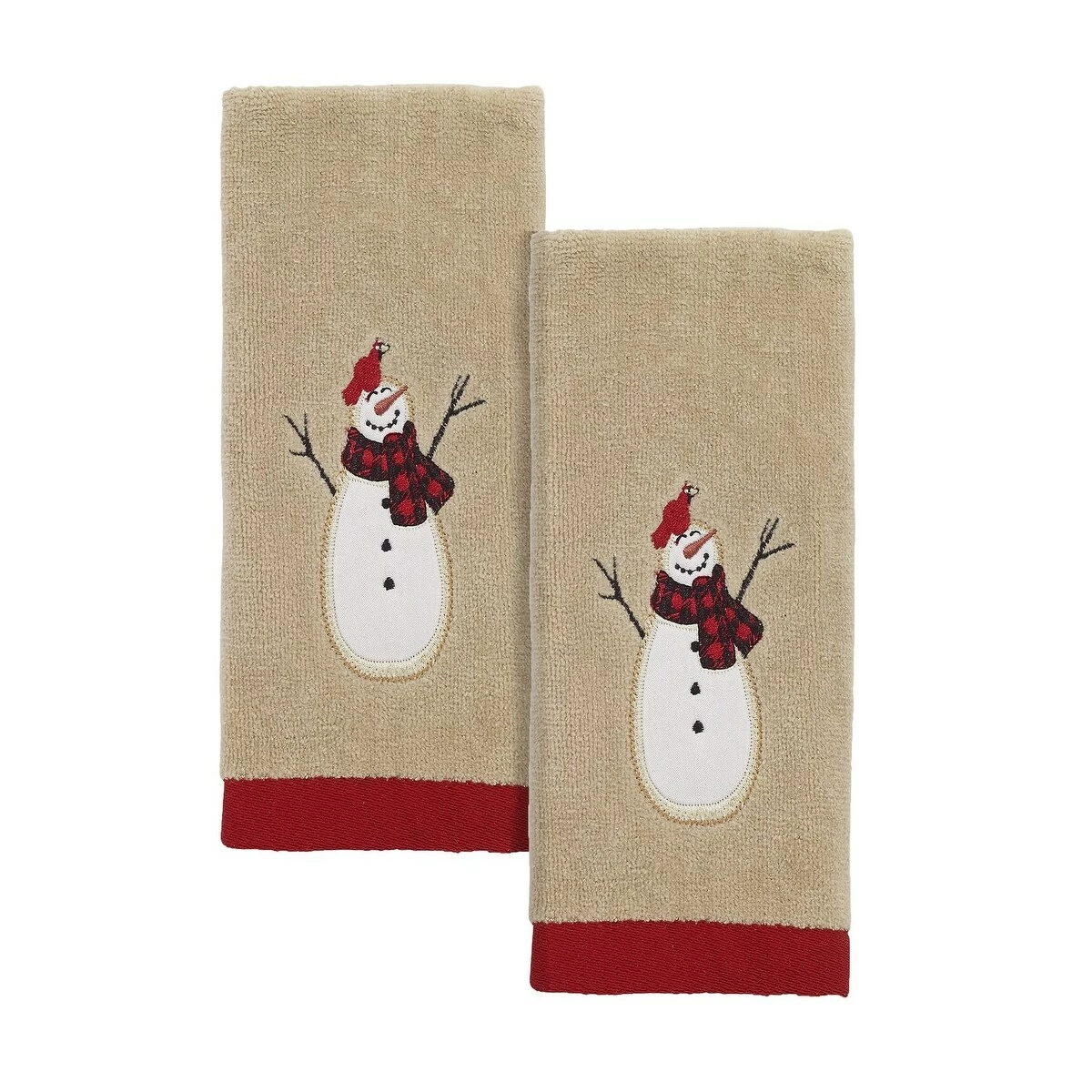 The Avanti Snowmen Gathering Fingertip Towel 2 Pack features a happy embroidered snowmen on a 100% cotton tan towel. The towel is finished with a coordinating red woven border. Imported.