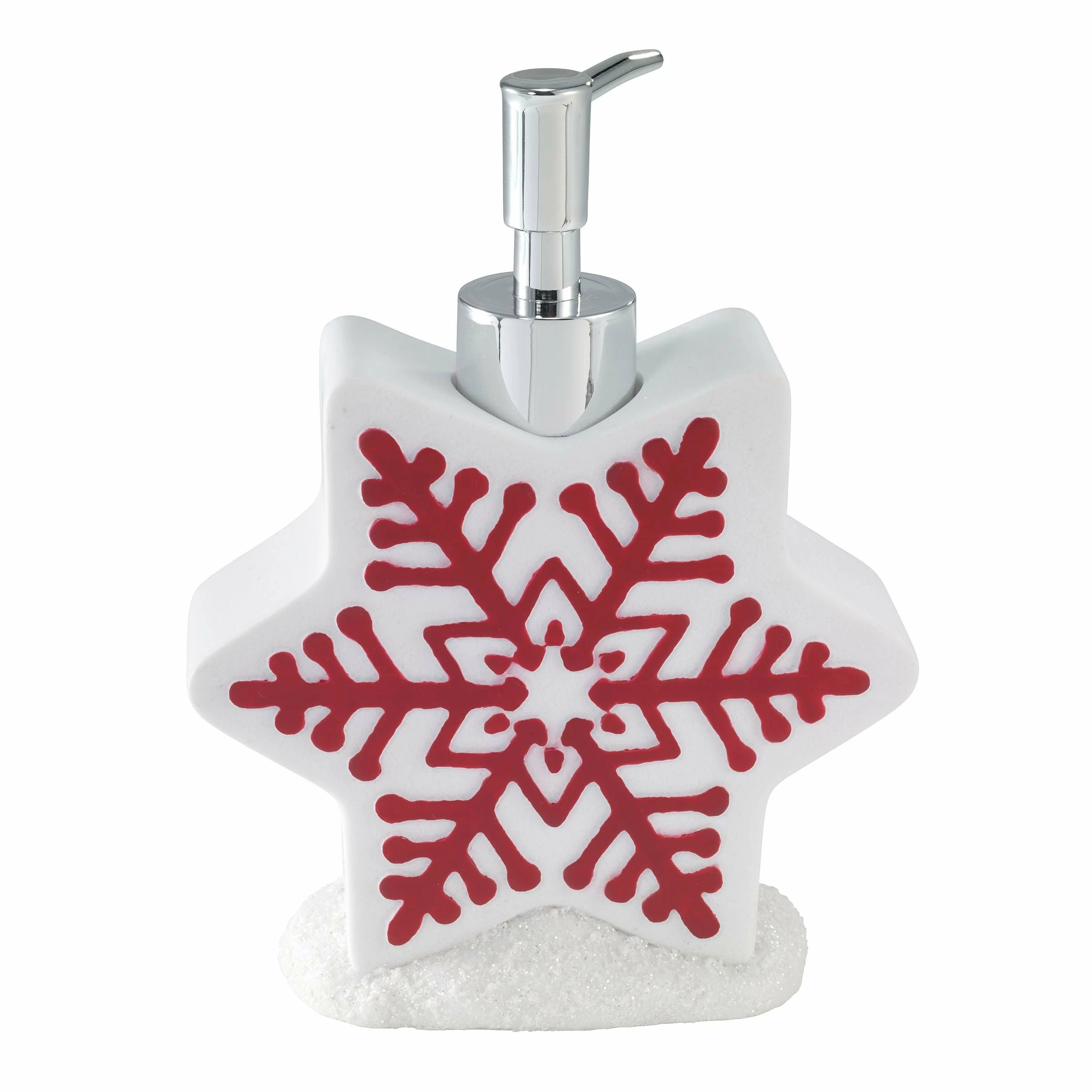 The Avanti Sparkle Lotion/ Soap/ Sanitizer Dispenser features a brick red snowflake on a white ground on a star-shaped body sitting on a base of snow. It’s a perfect way to add a touch of the holidays to any bathroom, kitchen or office. Made of durable, hand-painted resin.