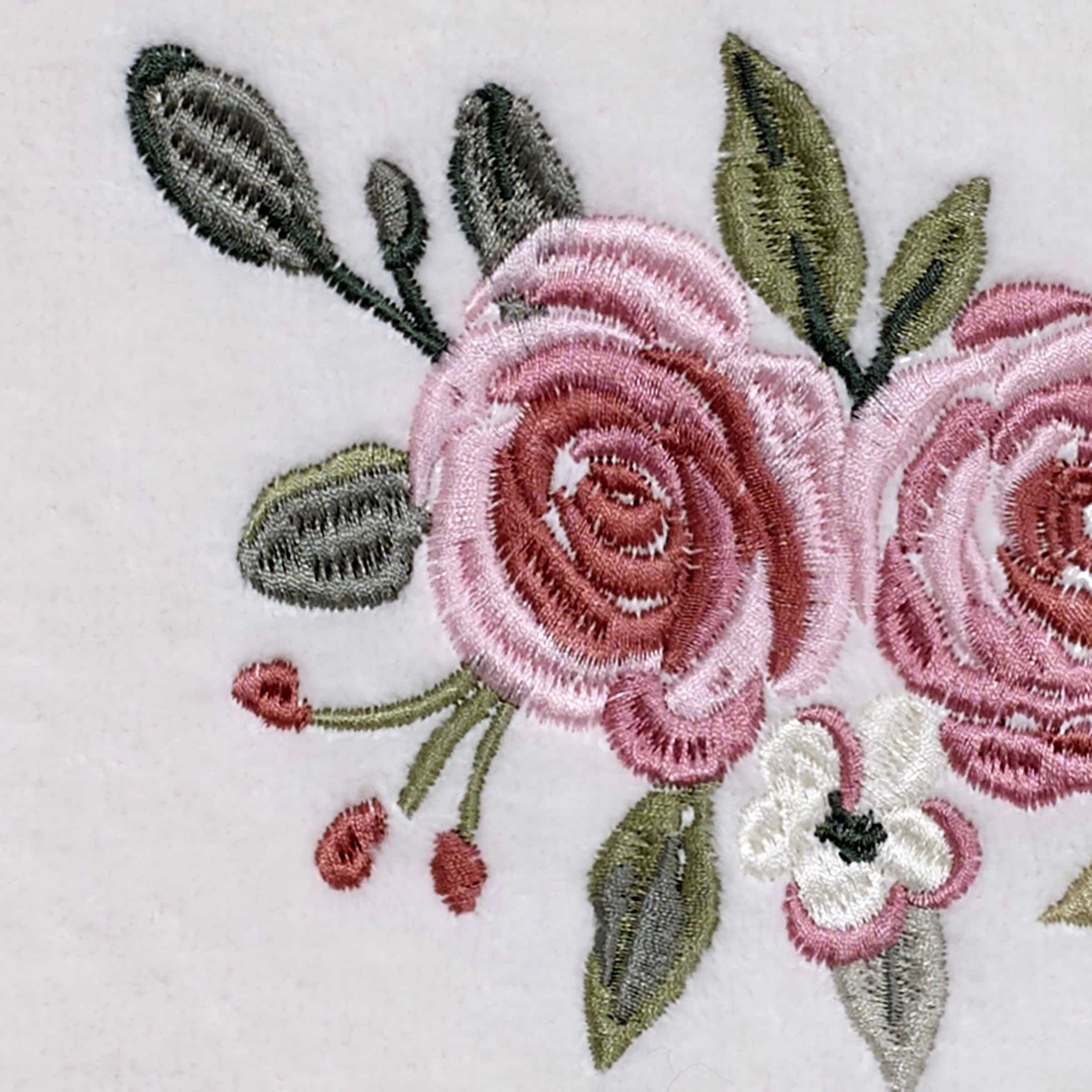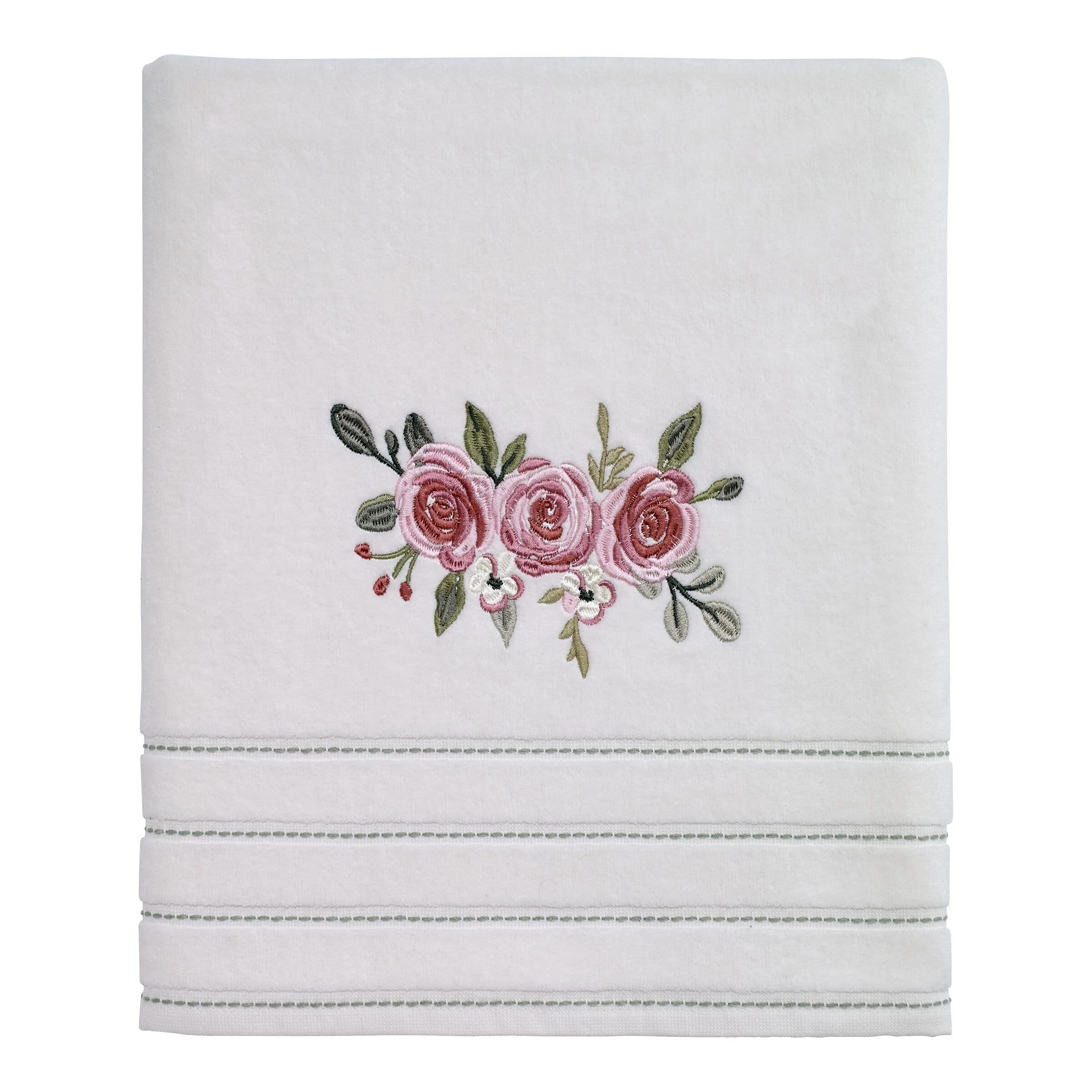 The Avanti Spring Garden Bath Towel is decorated with 3 embroidered peonies in shades of pink with green leaves and woven, yarn-dyed green border stripes on an ivory ground. Made of soft and absorbent 100% ring spun cotton, 27 x 52 inches. Coordinating pieces also available. Imported.