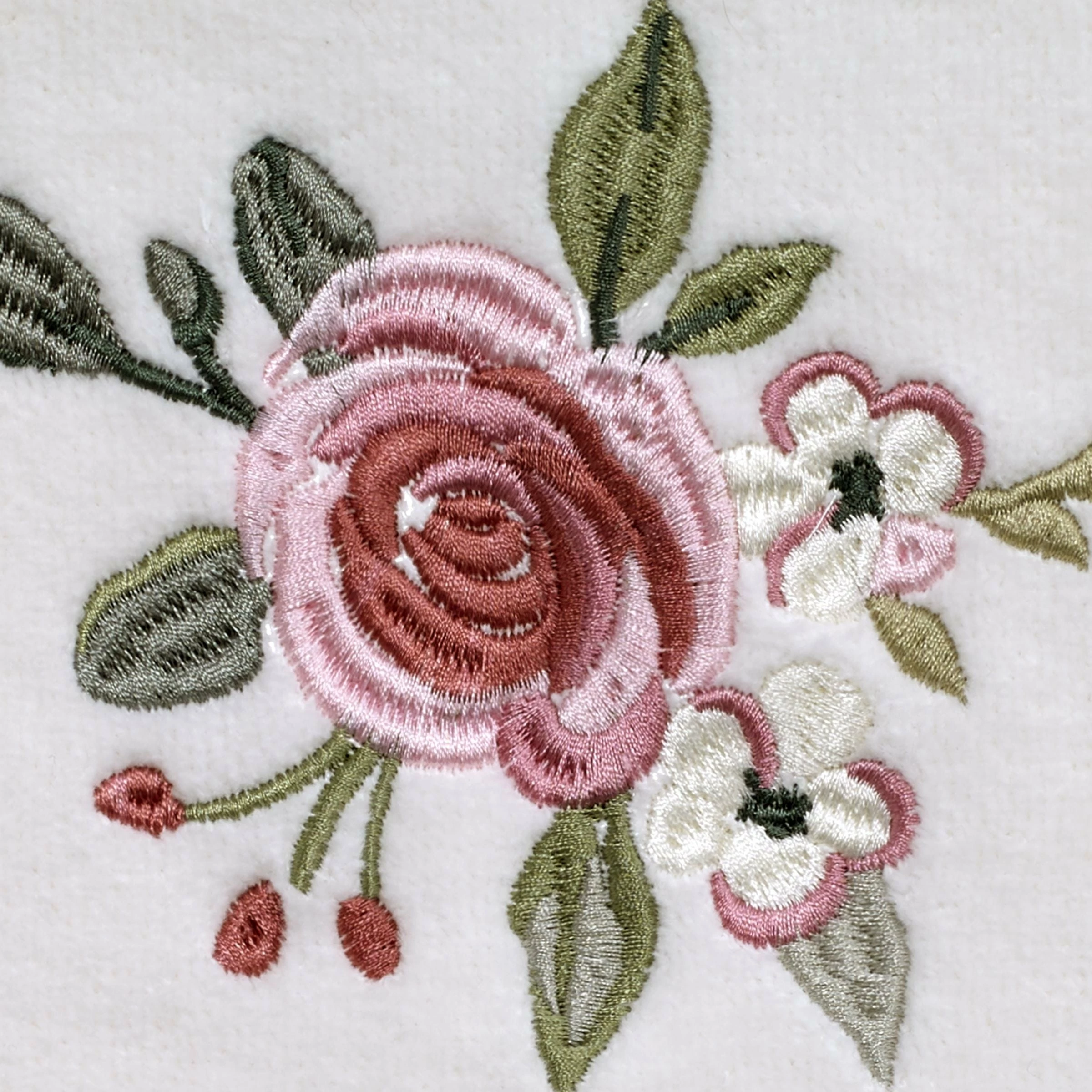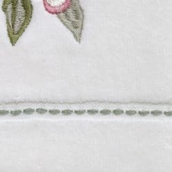 The Avanti Spring Garden Hand Towel is decorated with an embroidered peony in shades of pink with green leaves and woven, yarn-dyed green border stripes on an ivory ground. Made of soft and absorbent 100% ring spun cotton, 16 x 28 inches. Coordinating pieces also available. Imported.