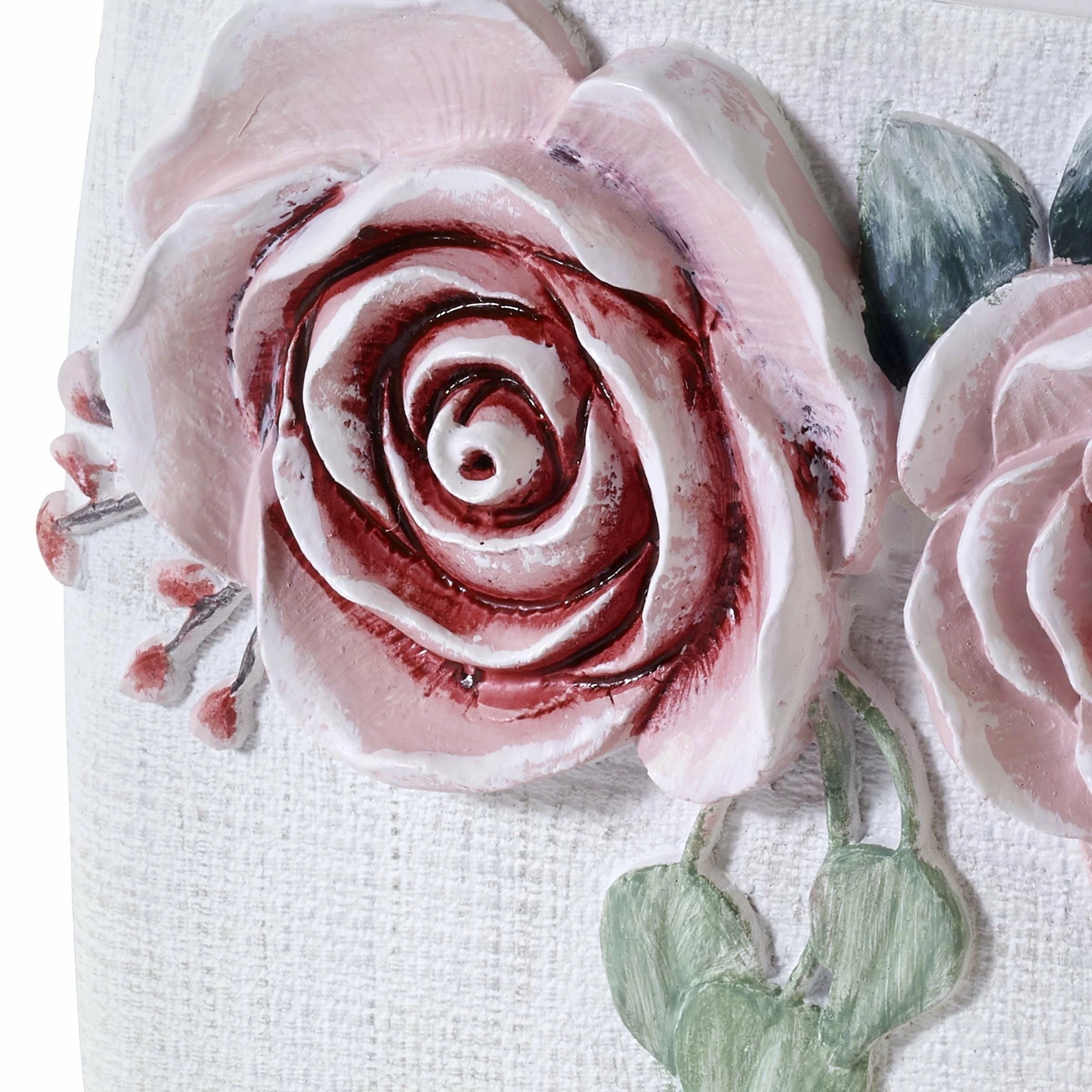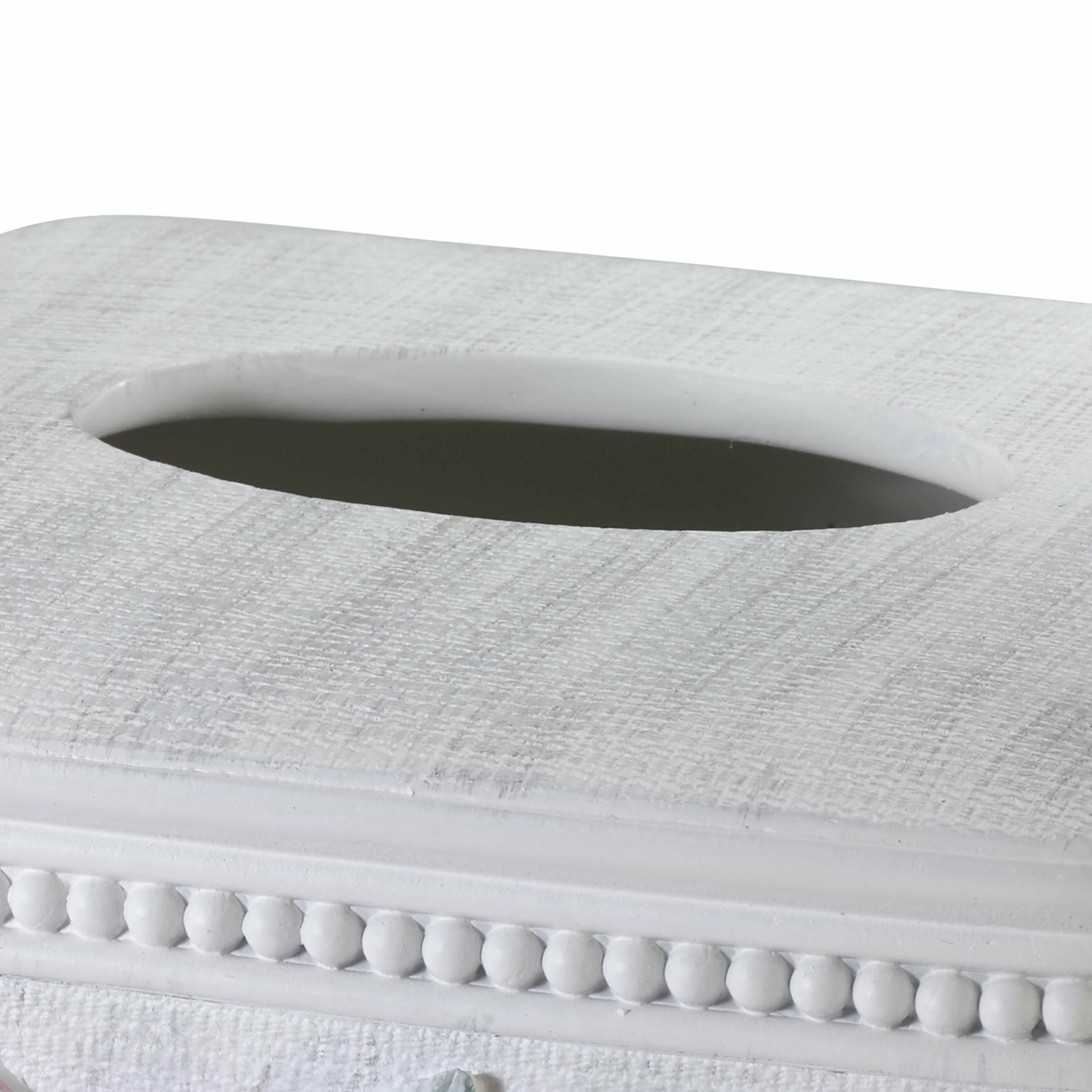 The Avanti Spring Garden Collection Tissue Cover is embossed with dimensional peonies in pink and white with green leaves on an off-white textured ground and crown molding detail around the top. Made of durable, hand-painted resin. Coordinating pieces also available. Imported