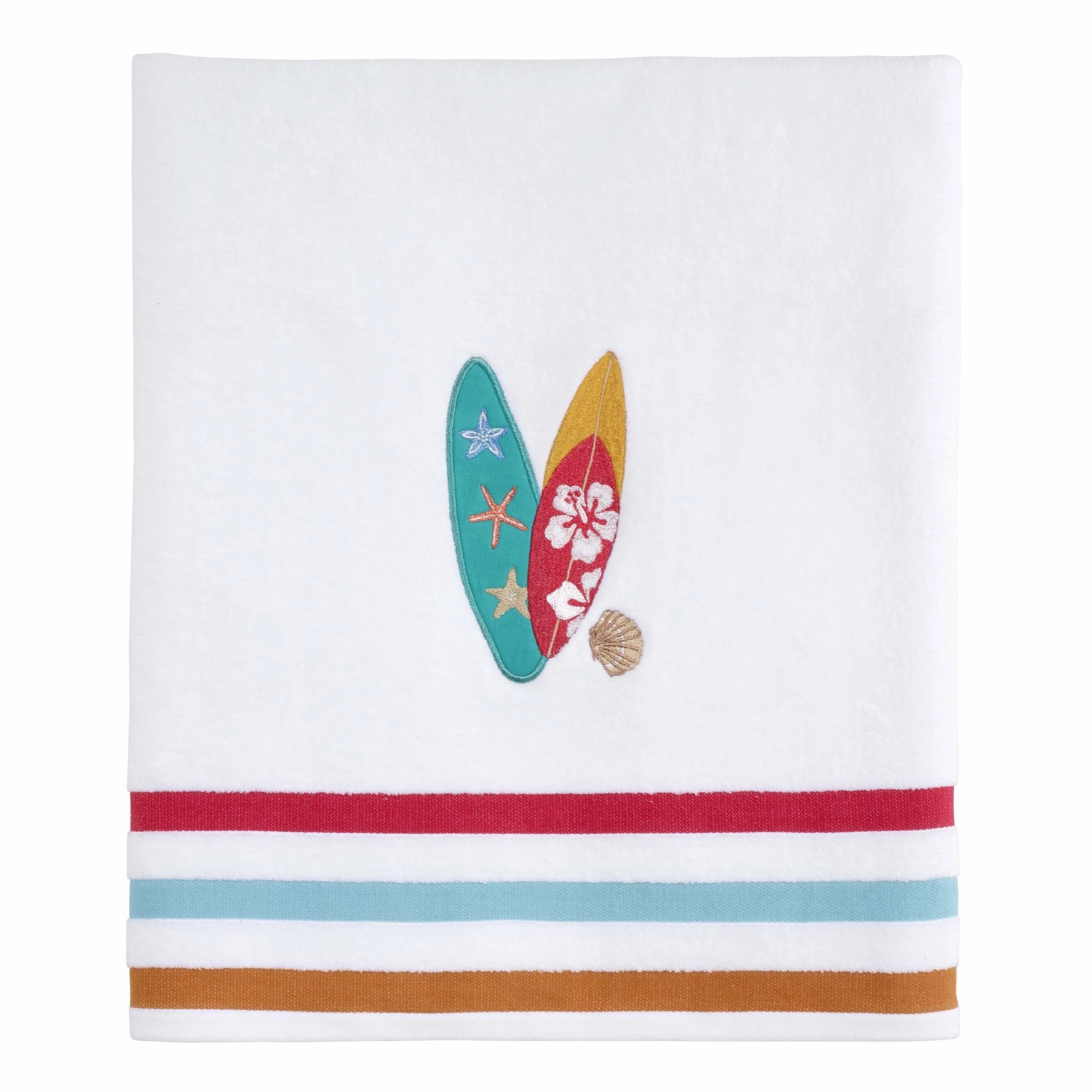The Avanti Surf Time Decorative Bath Towel features 2 brightly colored embroidered surfboards in green and yellow/coral & shell on the side. The 27″ x 52″ white terry towel is made of 100% cotton (excl. of embellishment). The sky blue, coral and mustard borders add the perfect finish to the towel.